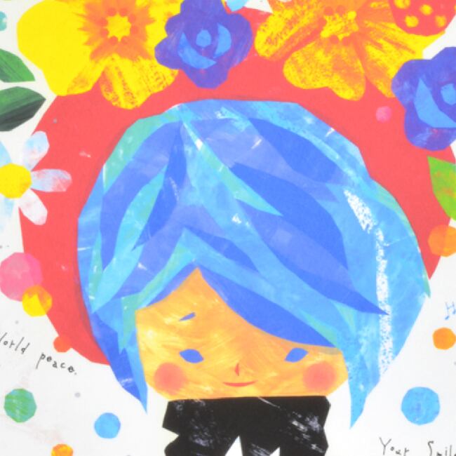 鮮やかな青い髪の少女が、小さな白い猫を胸に抱く姿が印象的です。まわりには黄色やオレンジの花々が咲き、背景には「World peace」「Your smile」「My family」といった言葉がやさしく浮かびます。シンプルな構図の中に、人を思う温かな気持ちがあふれる作品です。