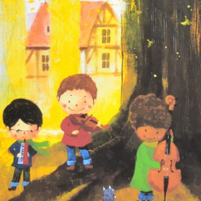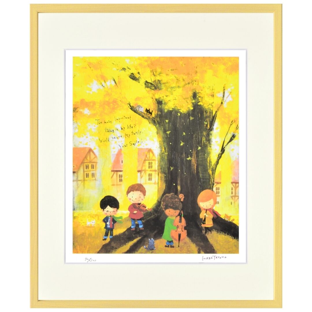 黄金色の木々に包まれた広場で、子どもたちが楽器を奏でています。バイオリン、チェロ、クラリネットが優しい音を重ね、秋の風にのって街に響きます。大きな木の根元には猫が寄り添い、枝の上にも黒猫が見守るように座っています。背景には「World peace」「My family」「Your smile」という言葉が、静かに寄り添うように描かれています。