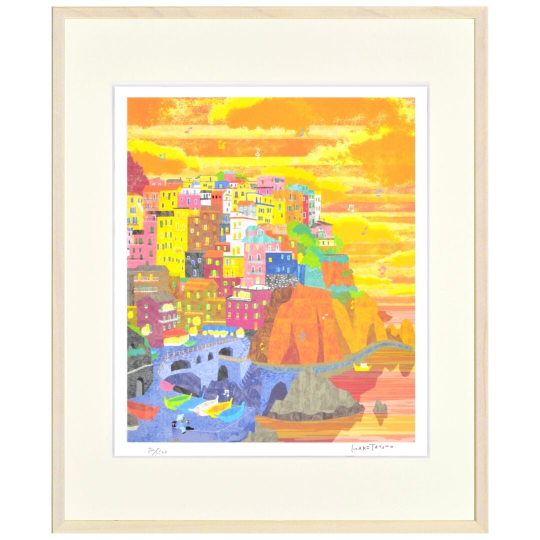 赤やオレンジ、ピンク、ブルーの家並みは、暮らしの温もりや人々の息づかいを感じさせ、海辺に浮かぶ小舟が静けさを添えています。夕陽が沈むひととき、世界が柔らかく溶け合うような美しさを描いた一枚です。見る人の心に、旅の記憶と郷愁を呼び起こします。