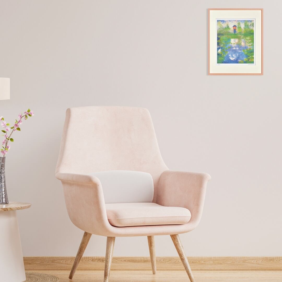 透明な光に包まれた池の水面に、スイレンが静かに咲く情景を描いた作品です。