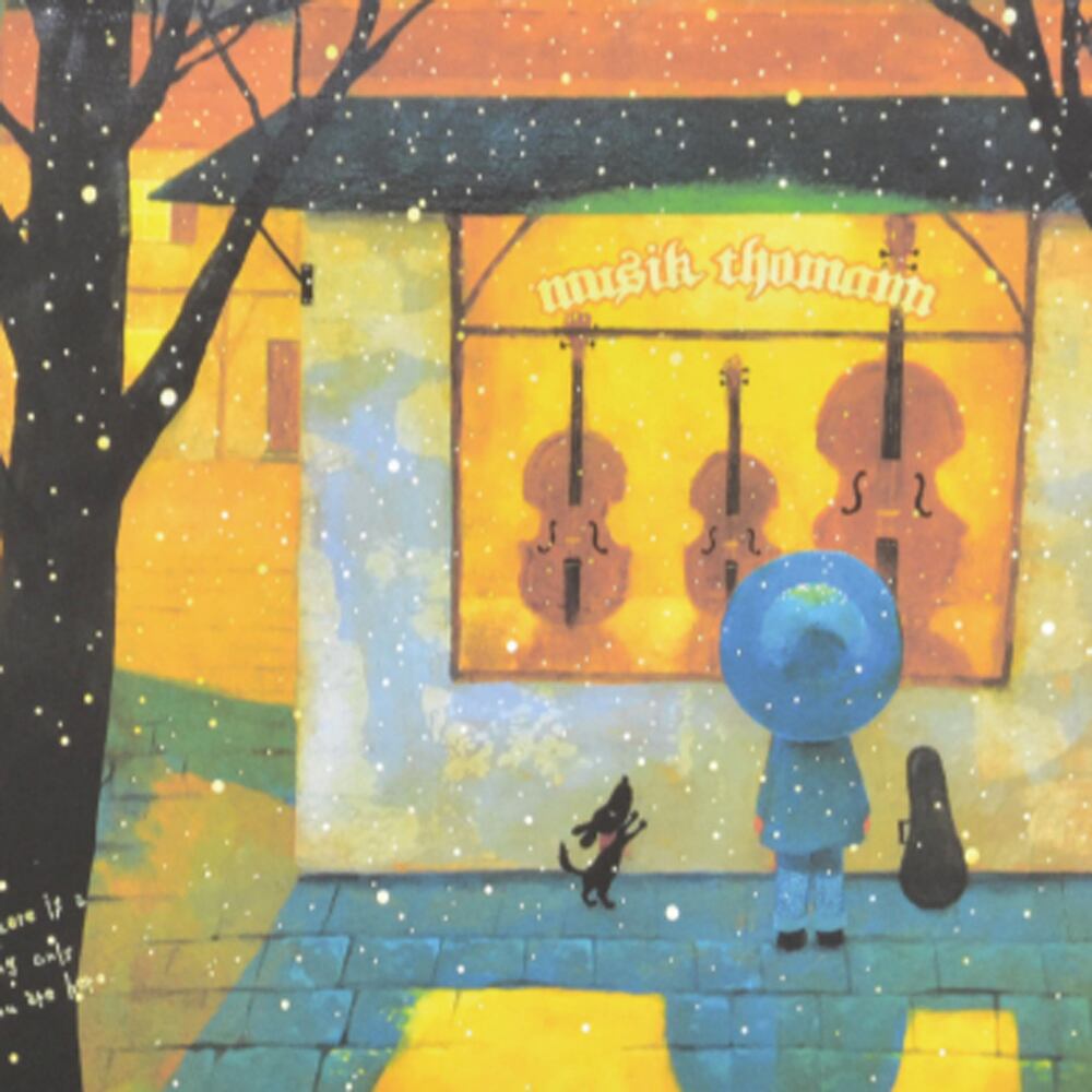 あたたかな灯りに照らされた楽器店のショーウィンドウを描いた作品です。