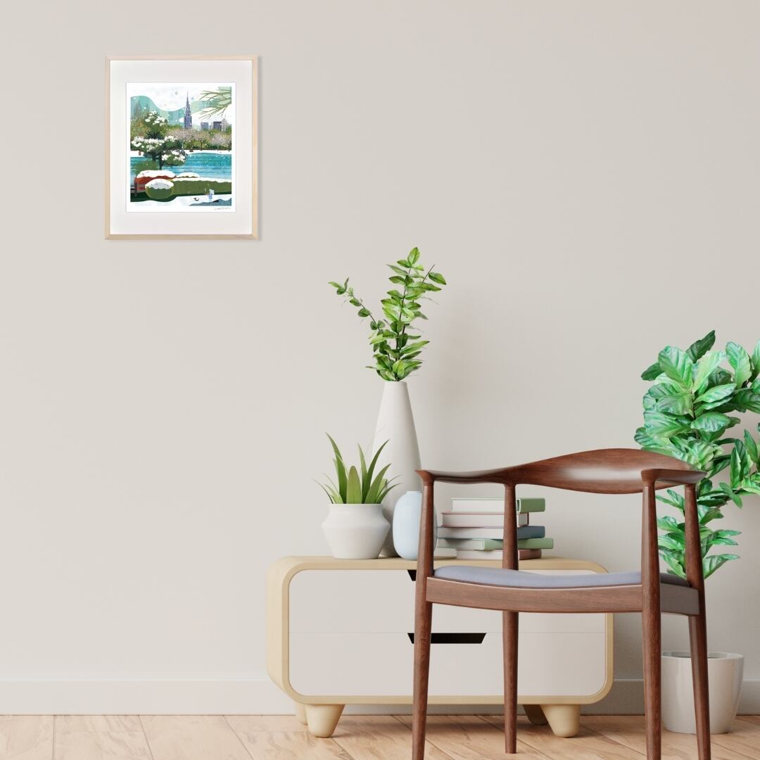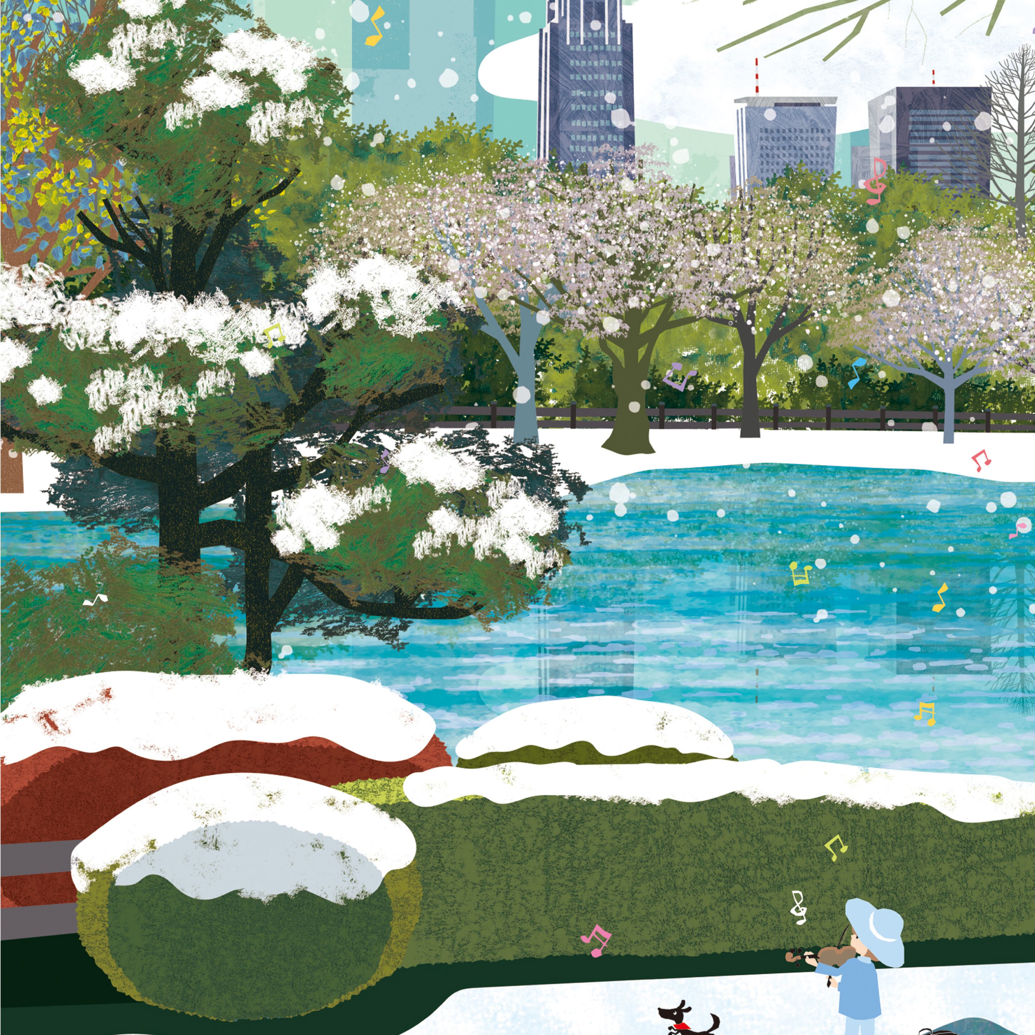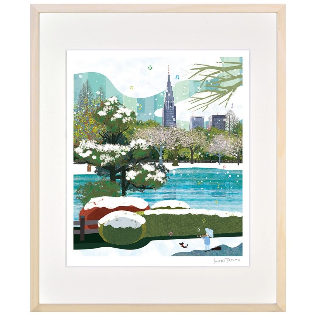 冬の名残を感じさせる雪景色の中に、やわらかな陽光とともに芽吹きの気配を感じる木々が描かれたイラストは、静寂の中に確かな生命の息づかいを感じさせます。澄んだブルーと優しいグリーンが織りなす色彩は、都会の風景に寄り添う自然の美しさを穏やかに映し出し、眺めるほどに心が落ち着いていくようです。建物の凛とした存在感と、やわらかに広がる自然の調和が印象的で、日常の中にある静かな時間の尊さを思い出させてくれるアートです。