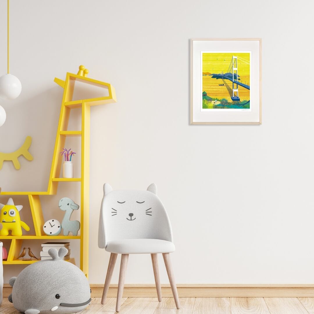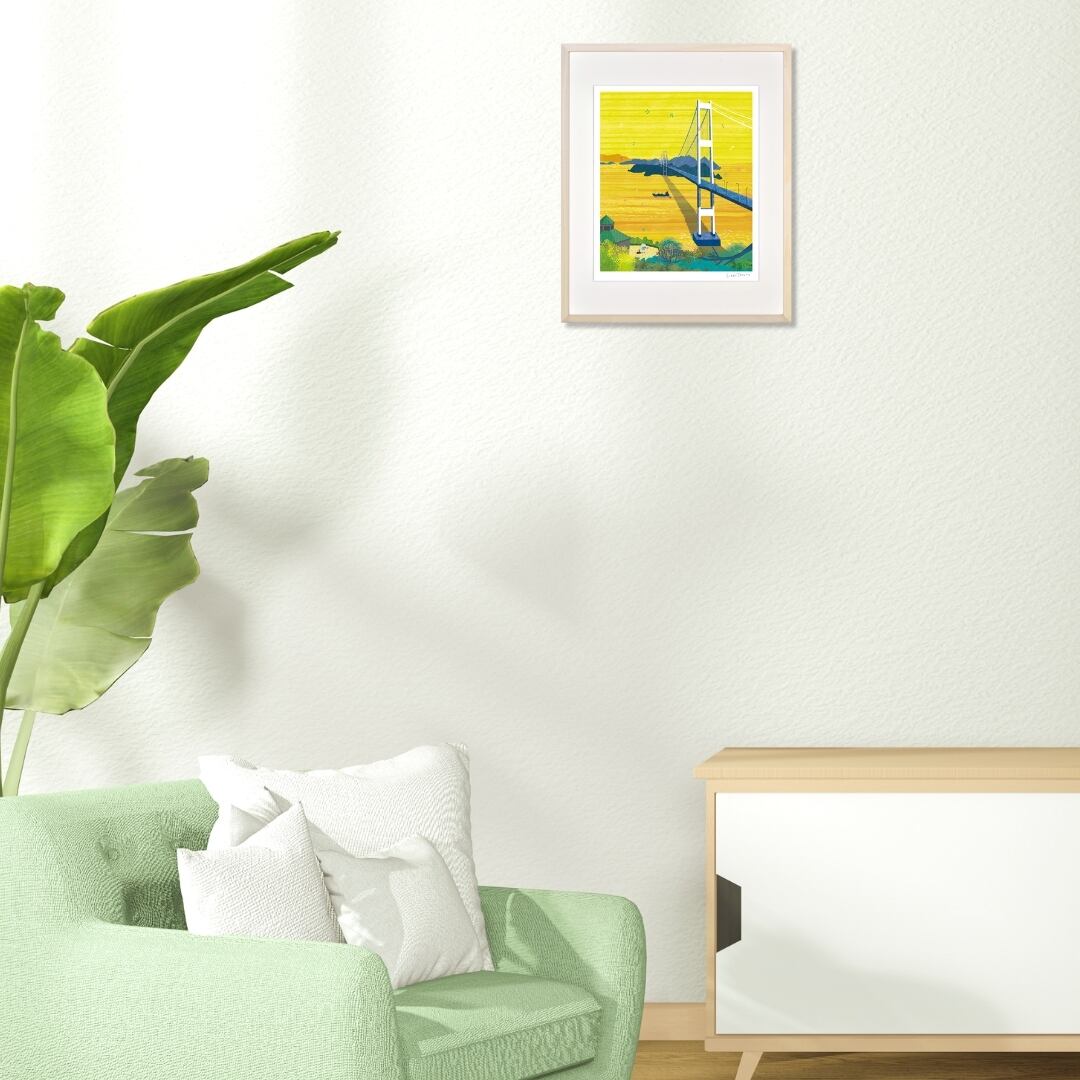 鮮やかな黄色に染まる海と空を背景に、堂々とした橋が力強く伸びる構図が印象的なアートです。水平線の向こうへと続く橋の姿は希望と未来を象徴し、どこまでも続く旅路を感じさせます。青と黄色のコントラストが美しく、光を浴びた海面が金色に輝く様子はまるで音楽のように心を躍らせます。遠くに見える船や山並み、そして足元の緑が、自然と人の営みが調和する瞬間を描き出しており、見るたびに新しい発見と前向きな気持ちを与えてくれます。