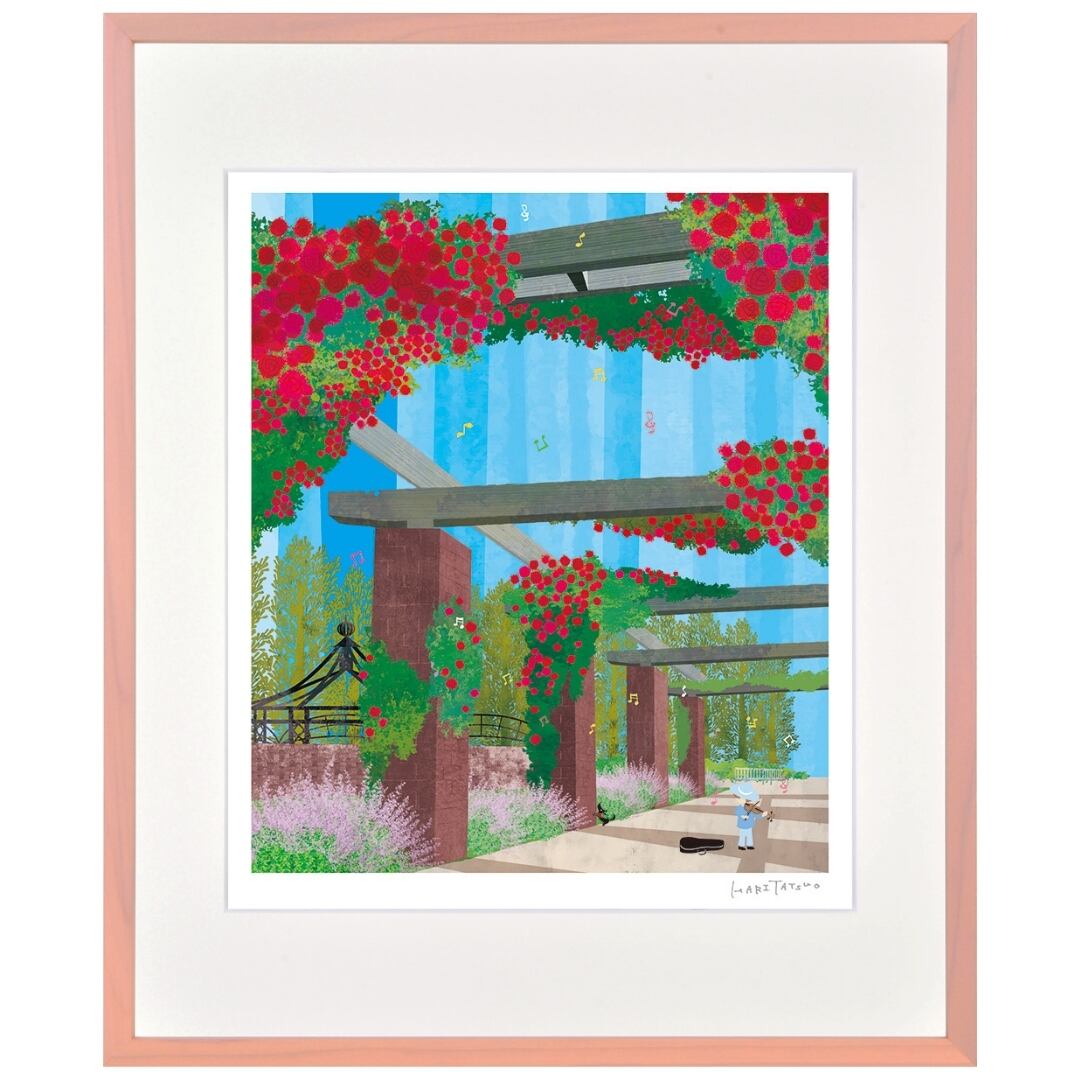 色鮮やかな赤い花々がアーチを描くように咲き誇り、青空のもとで柔らかな光を受けて輝く光景が印象的なアートです。整然とした構造物と自然の美しさが調和し、人の手と自然の力が共に作り出す美のバランスを感じさせます。レンガの柱に絡む花の蔓や、奥へと続く小径が穏やかなリズムを生み出し、静かな中にも生命の息吹が満ちています。明るく開放的な空間の中で、季節の彩りと心の安らぎを感じさせる作品です。