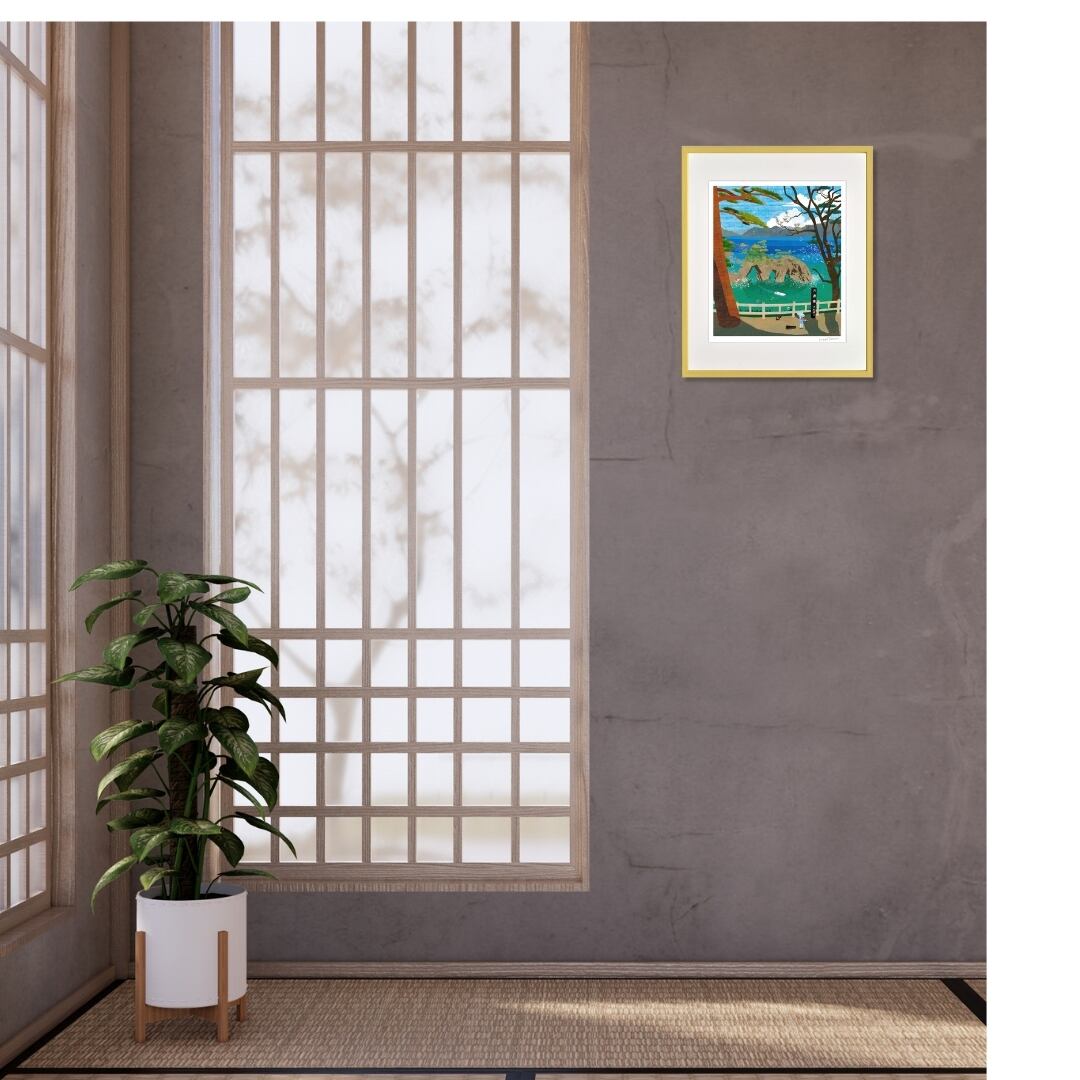 青く透き通る海と、力強く伸びる松の木が美しいコントラストを描き出す印象的なアートです。波に削られた岩肌とその奥に見える海の輝きは、自然の壮大さと静けさを同時に感じさせ、まるで潮風が吹き抜けるような心地よさを運んできます。遠くに広がる水平線が深い青から淡い空の色へと溶け合い、生命力あふれる木々がその景色を包み込むことで、自然の調和と力強さがひとつの画面に息づいています。見るたびに清々しい気持ちを呼び覚まし、心の奥に穏やかなエネルギーを届けてくれる風景画です。