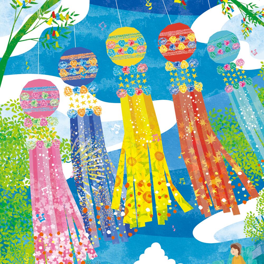 七夕の紙飾りが風に揺れる軒先、色とりどりの吹き流しが夏の空を背景に軽やかに揺れ、見る人の心を明るくしてくれる華やかなアートです。澄み渡る青空と風に舞う飾りのリズムが調和し、まるで音楽のような高揚感と楽しさを感じさせます。大胆でありながら繊細な色づかいが印象的で、空を見上げると希望や喜びが自然と湧き上がるような、ポジティブなエネルギーに満ちた作品です。青、黄、赤、ピンクといった彩りが心を弾ませ、幸福感とともに季節の息吹を感じさせてくれます。