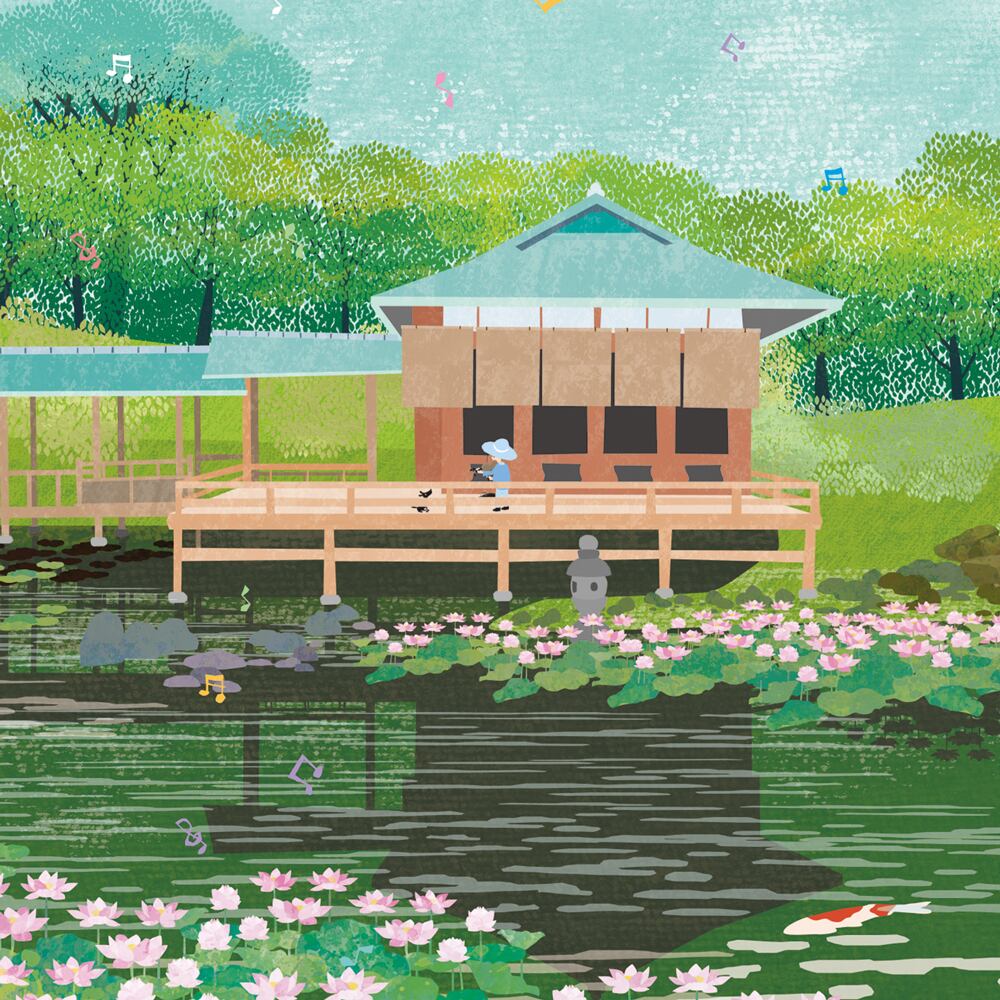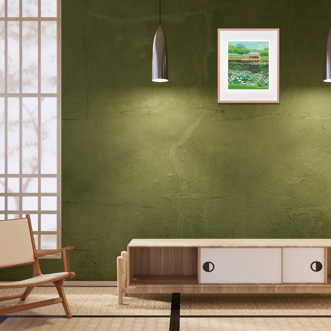 穏やかな水面に咲く淡いピンクの花々と、緑に包まれた静かな庭園の情景が描かれたアートです。水面を漂う睡蓮の花が風にそよぎ、木々の緑が優しく映り込む風景は、心を静めてくれるような癒しの時間を感じさせます。光の粒がやわらかく広がるような色彩表現によって、自然の中に流れる穏やかな空気や水音まで想像させ、見ているだけで深呼吸したくなるような清涼感が漂います。静けさの中にも生命の息吹を感じるような繊細な描写が印象的で、眺めるたびに心を穏やかに整えてくれるアートです。