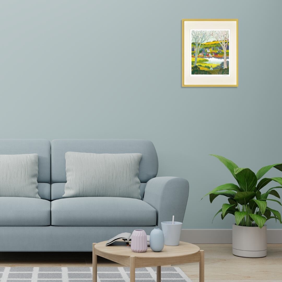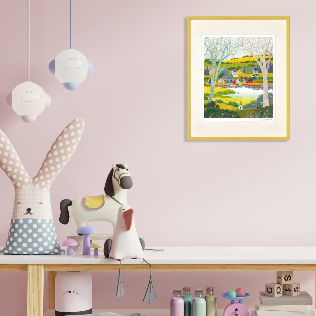 色とりどりの家々が並ぶ穏やかな村の風景を、やわらかな色彩で描いた心あたたまるアートです。春を思わせるやさしい光に包まれ、咲き誇る花々や湖面のきらめきが静かに季節の息吹を伝えます。遠くまで広がる黄色の花畑と、緑の丘の重なりが美しく、穏やかな時間が流れる風景は、どこか懐かしい温もりを感じさせてくれます。柔らかいタッチと明るい色調が調和し、見る人の心をそっと癒すやさしい風景画です。