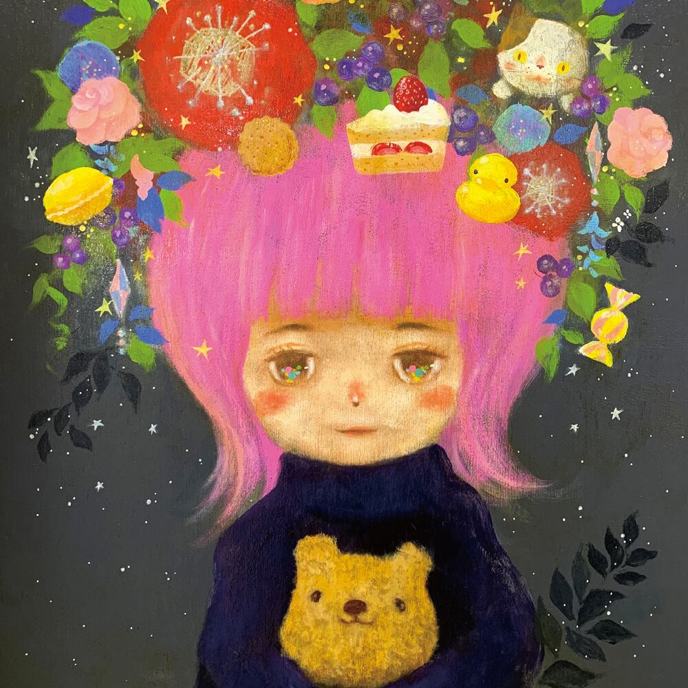やわらかな光に包まれた少女が、胸に小さなぬいぐるみを抱きしめています。ピンクの髪には花やお菓子、星や小さな動物たちが咲くように浮かび、心の中の“しあわせ”がそのまま形になったようなファンタジックな世界が広がります。少し切なげな表情の中にも、やさしさと希望の光が感じられ、見る人の心をそっと癒してくれるアートです。夜空のような背景とのコントラストが美しく、夢と現実のあわいを描いた印象的な作品です。