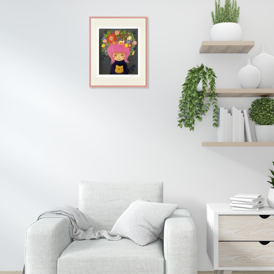 このインテリアアートは、可愛らしさと静けさを併せ持つ独特の存在感で、空間にやさしい彩りを添えます。ピンクやゴールドのあたたかな色調が気持ちを和ませ、見るたびに小さな幸せを思い出させてくれるようです。日常に少しの夢と希望をプラスしたい方におすすめで、眺めるたびに心がやわらかくほどけていくような、穏やかな時間を届けてくれます。