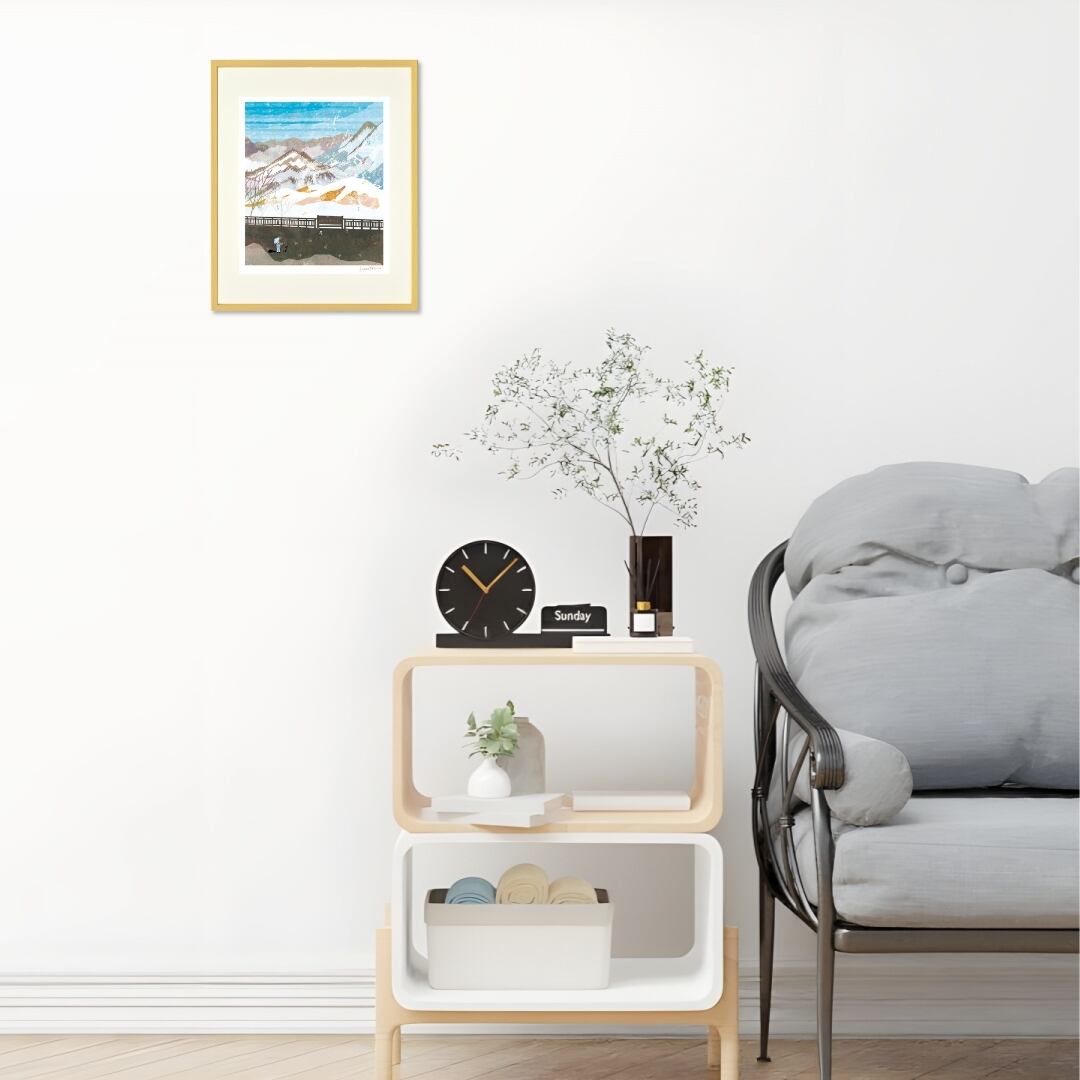 このインテリアアートは、雪景色の透明感と穏やかな色彩が空間に落ち着きを与えます。自然の静けさを感じるデザインは、忙しい日常の中に癒しをもたらし、心をリセットするような効果があります。北国の澄んだ空気を思わせる爽やかな色調が、モダンな空間にも調和し、清らかで上質な雰囲気を演出します。四季を感じたい方や、自然をテーマにしたお部屋づくりにぴったりの一枚です。