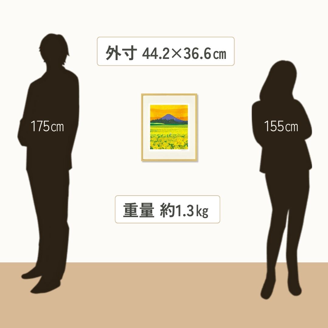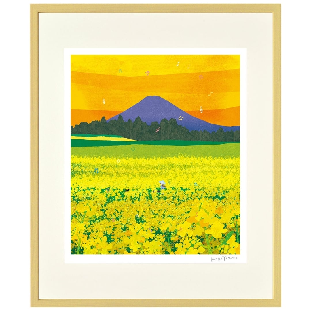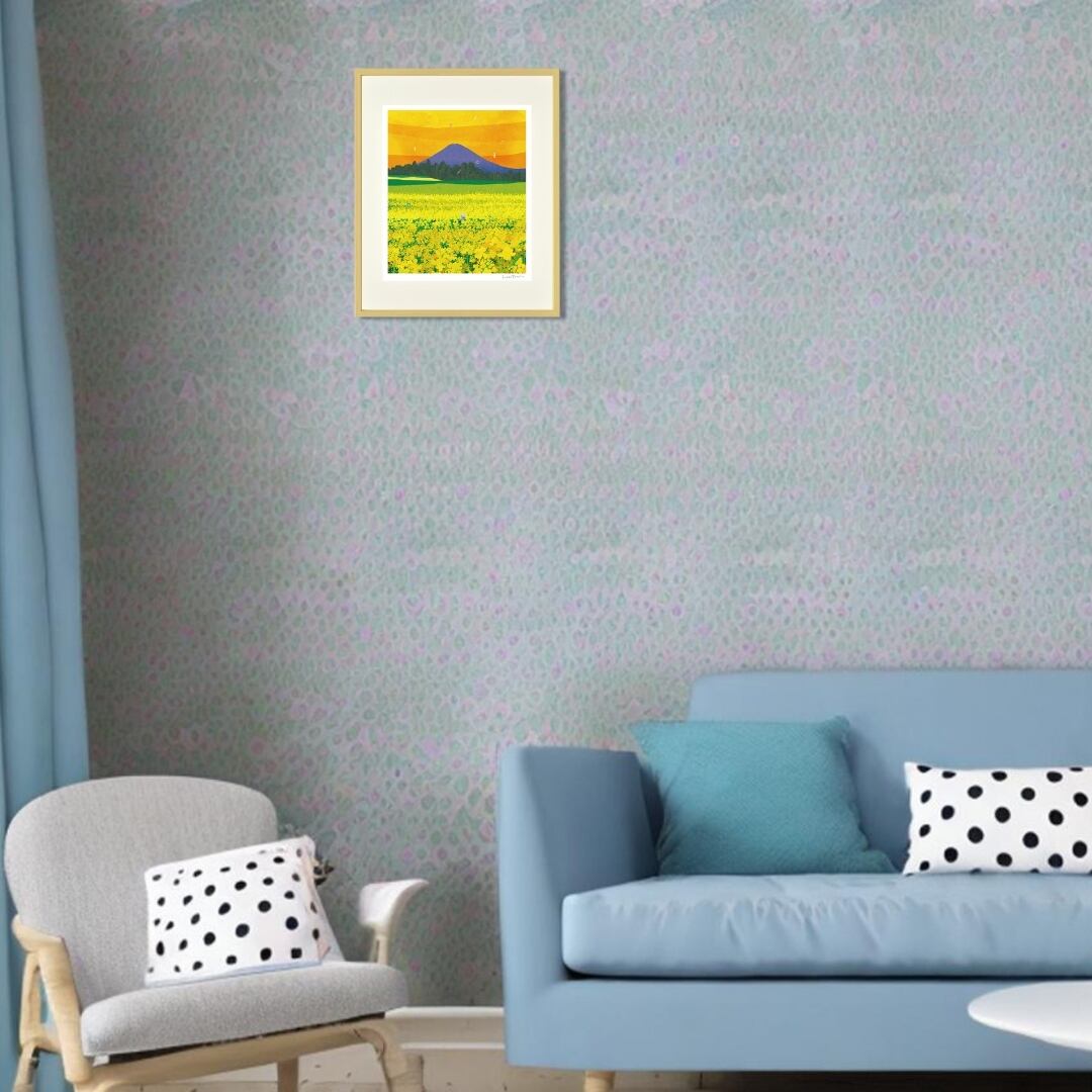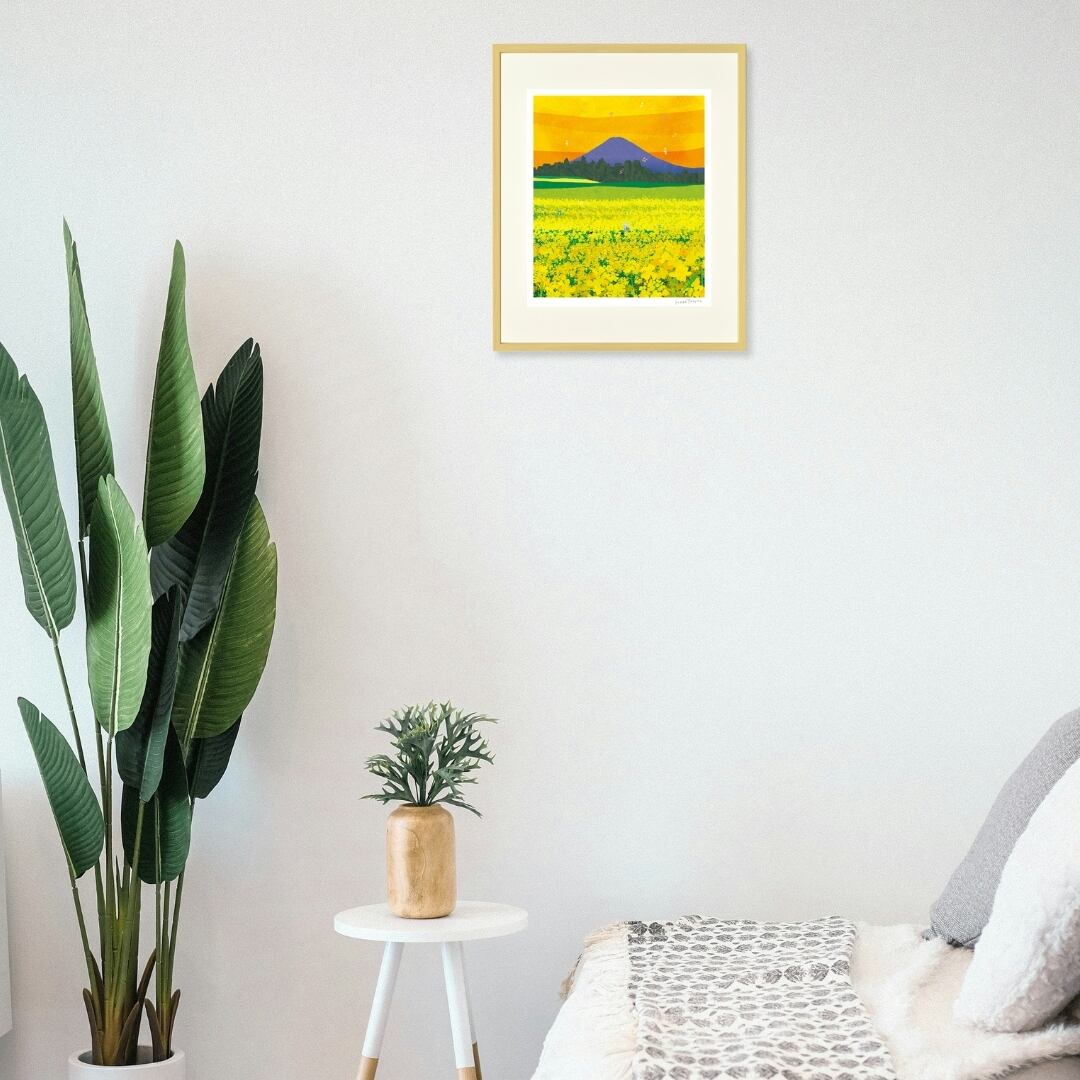 黄金色に輝く菜の花畑の向こうに、堂々とそびえる富士山を描いたインテリアアートです。静岡県の豊かな自然を舞台に、明るい陽射しと春の息吹がキャンバスいっぱいに広がります。菜の花の黄色と富士山の青、そして夕空のオレンジが美しく調和し、日本の四季の美しさを感じさせます。まるで暖かな風が吹き抜けるような明るさに満ちており、見る人の心を前向きにしてくれる作品です。日常の中に、春の希望や新しい始まりのエネルギーを届けてくれる一枚です。