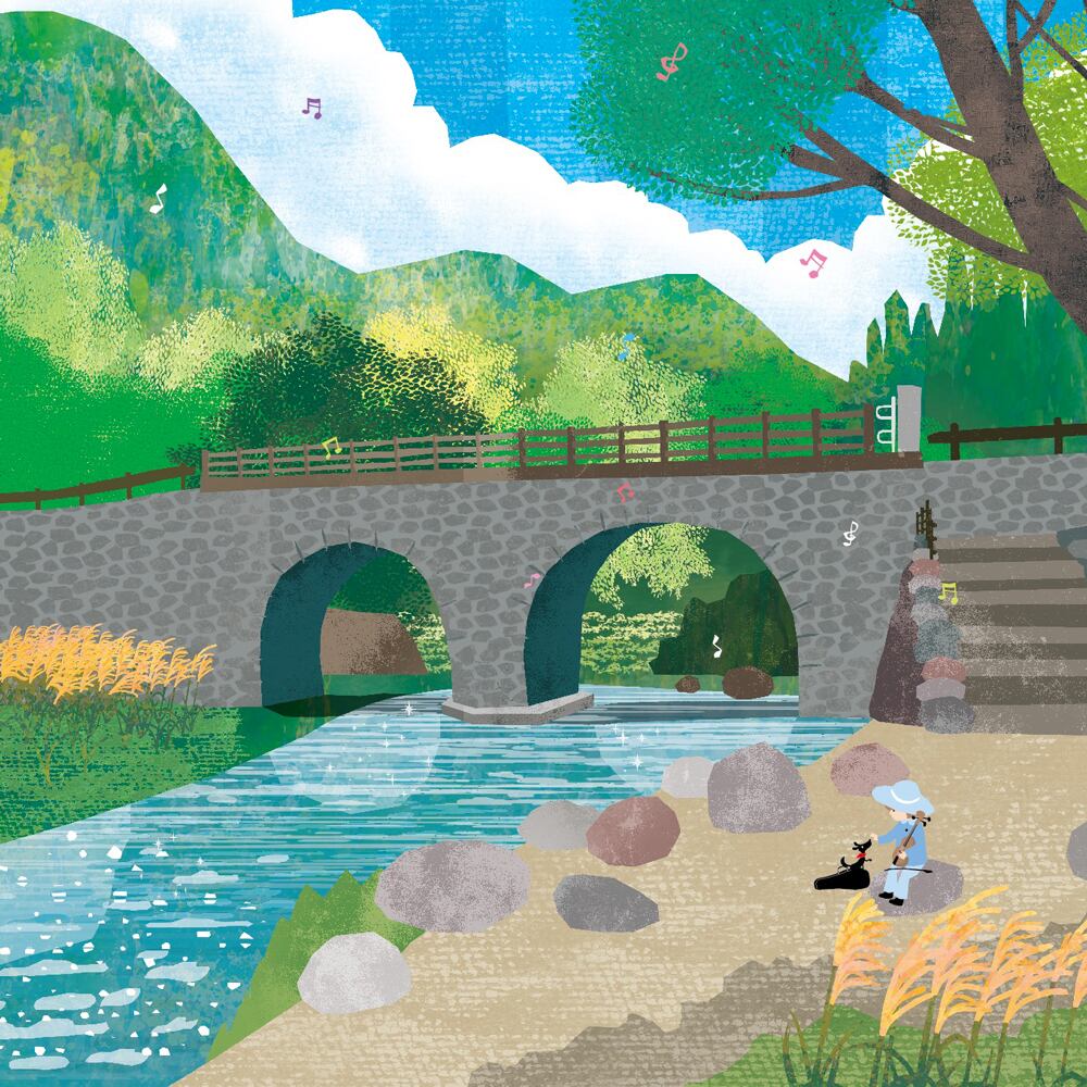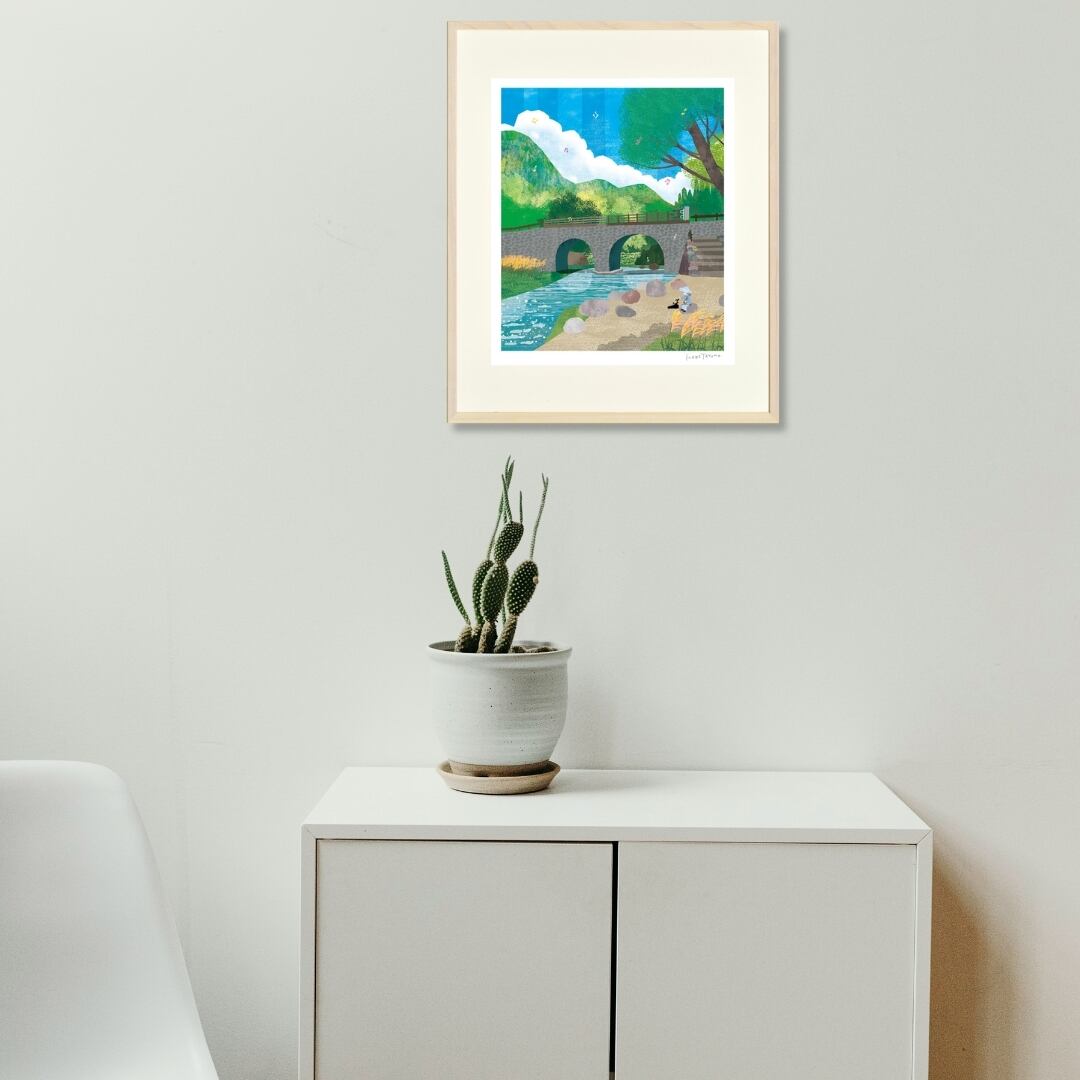 福岡県北九州市にある春吉の眼鏡橋をモチーフにしたインテリアアートです。石造りの橋が穏やかな川面に映り込み、ゆったりと流れる時間を感じさせます。青空と緑の山々が調和し、清々しい風が吹き抜けるような爽やかさが広がります。水辺に寄り添う人や草花の描写が柔らかく、日常の小さな幸せや穏やかな時間を思い出させてくれる作品です。自然と人の営みが調和する風景は、見るたびに心を静かに整えてくれるような安らぎをもたらします。