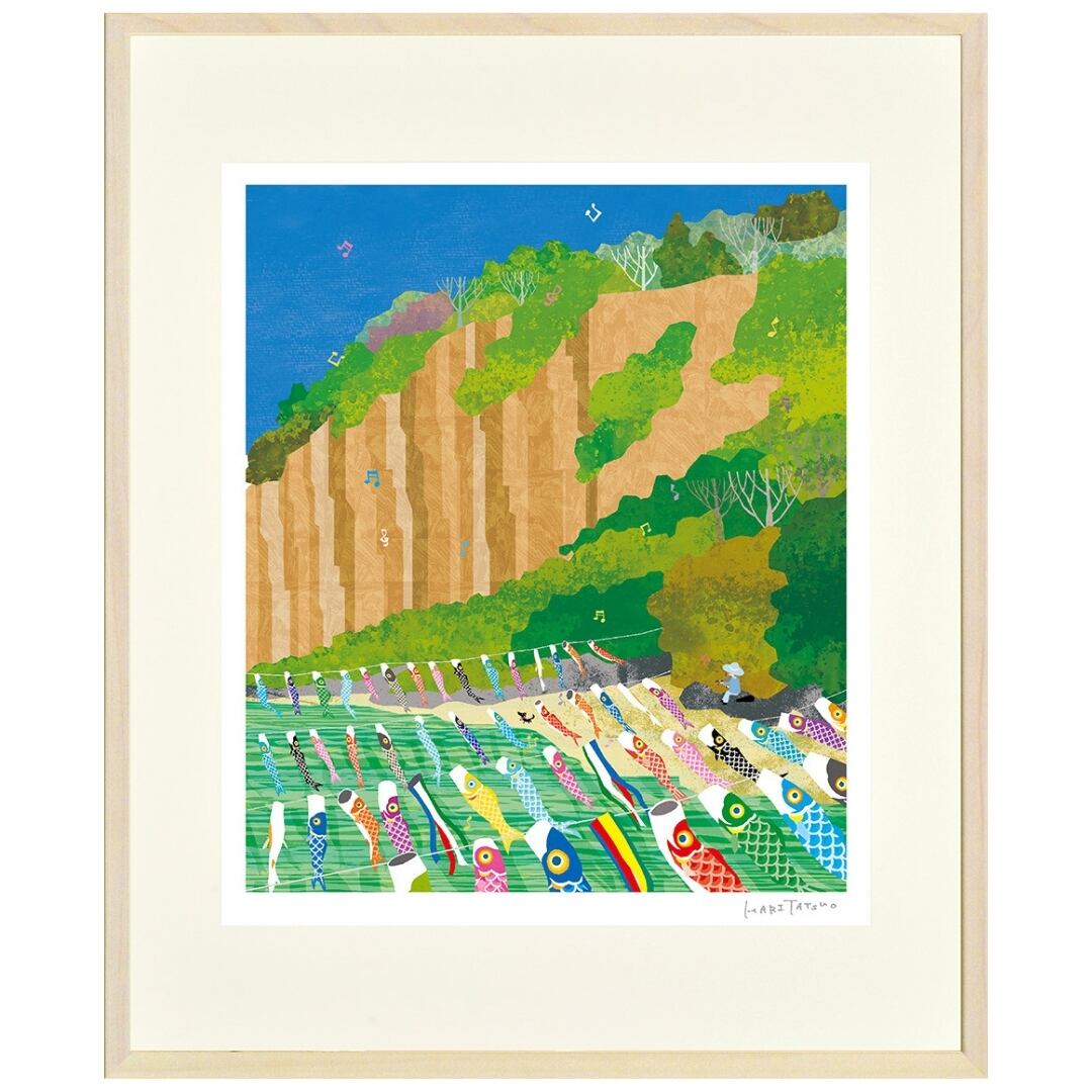 宮城県・材木岩公園をモチーフに描かれたインテリアアートです。青空の下、自然が織りなす壮大な岩肌と、空を泳ぐように舞う色とりどりの鯉のぼりが印象的に描かれています。新緑の季節を感じる爽やかな風景は、見る人に元気と希望を与えてくれるようです。岩肌の力強さと鯉のぼりの軽やかさが美しく調和し、自然と人の営みが一体となった春から初夏の風景を表現しています。心地よい風が吹き抜けるような、開放感あふれる一枚です。