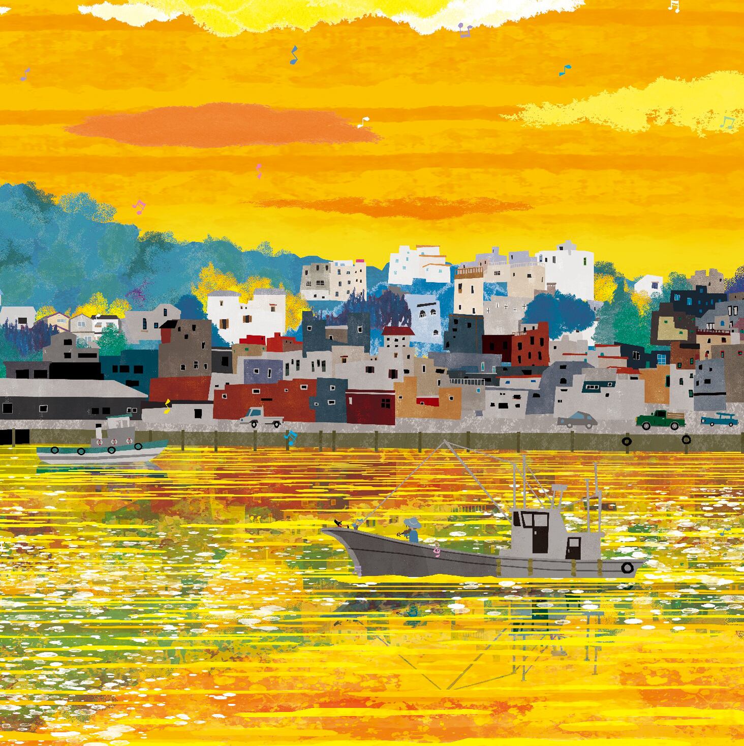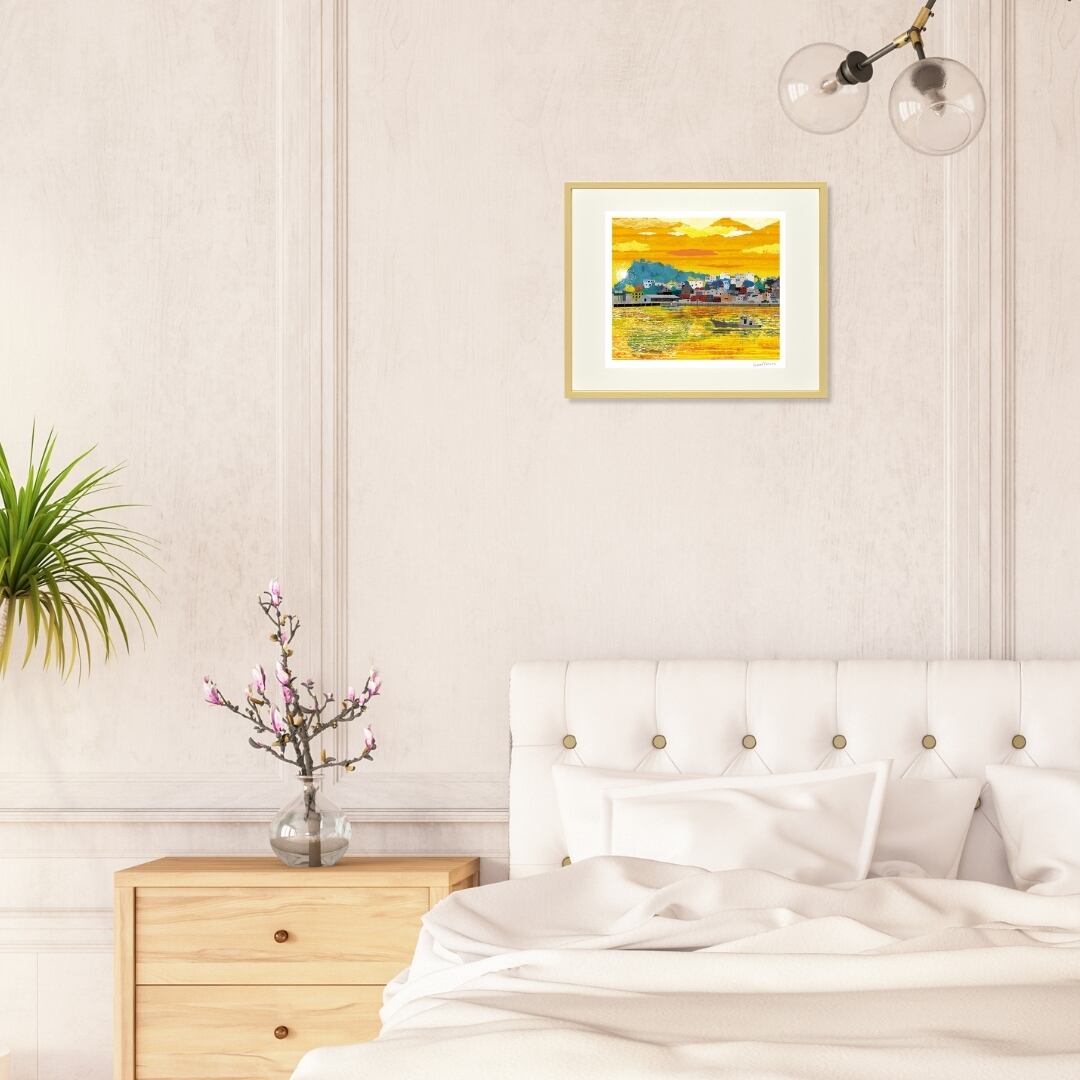 黄金色の夕陽が海面を照らし、静かな港町を優しく包み込む情景を描いたインテリアアートです。カラフルな家々が並ぶ街並みと、ゆっくりと進む漁船の姿が、どこか懐かしい日本の原風景を思い出させます。オレンジからイエローへと移ろう空の色が、穏やかな時間の流れを感じさせ、見る人の心を温めます。海面に映る光のきらめきが美しく、まるで波の音が聞こえてくるような臨場感にあふれた作品です。郷愁と癒しが共存する、心に残る一枚です。