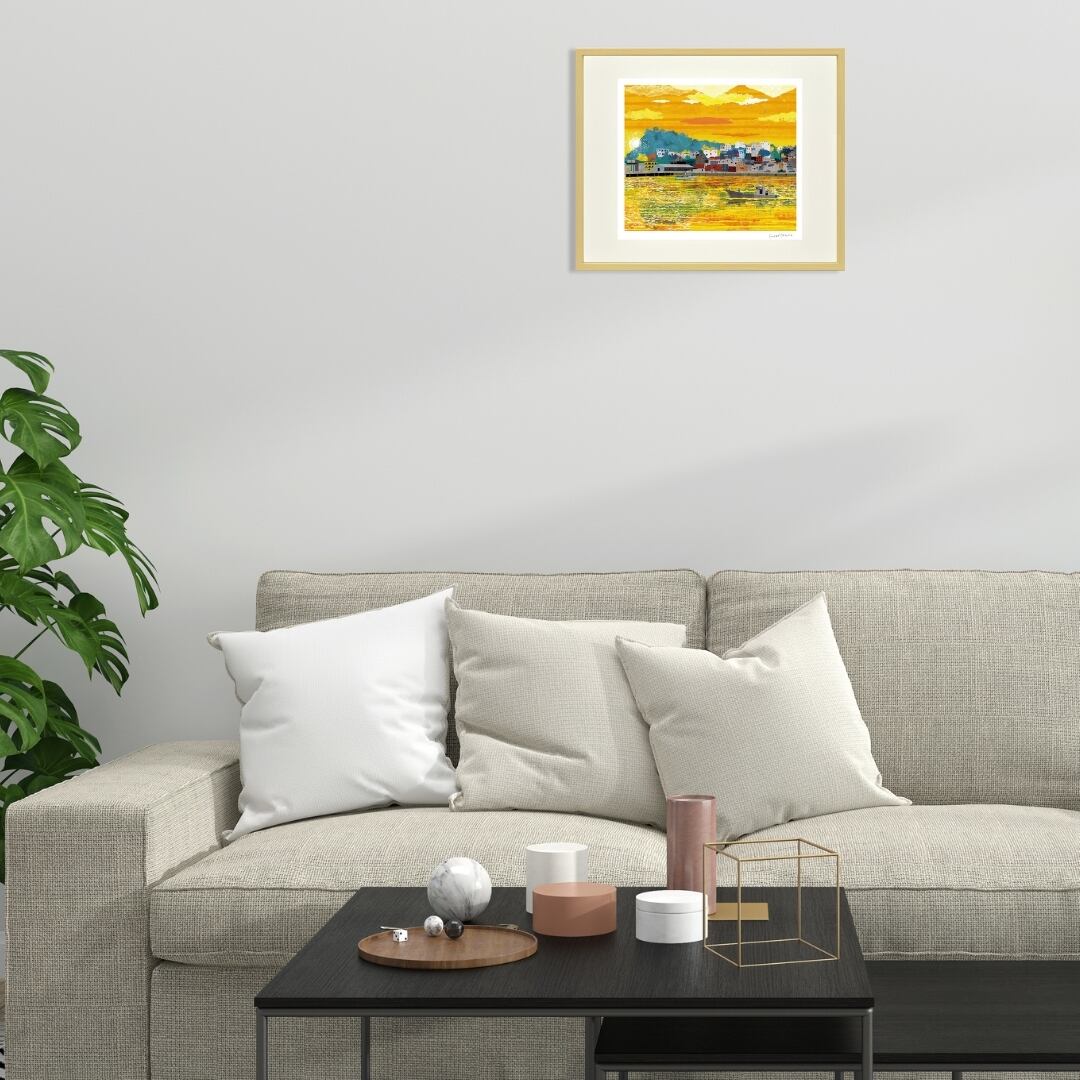 このインテリアアートは、夕焼けの温かな色彩が空間に優しい輝きを与え、落ち着きのある雰囲気を演出します。イエローやオレンジの明るいトーンは、部屋にあたたかさと前向きなエネルギーをもたらし、日々の暮らしに穏やかな彩りを添えます。どんなインテリアにも馴染みやすく、見るたびに心を癒してくれる風景画。穏やかな港の光景が、忙しい日常の中に静かな安らぎを運んでくれます。