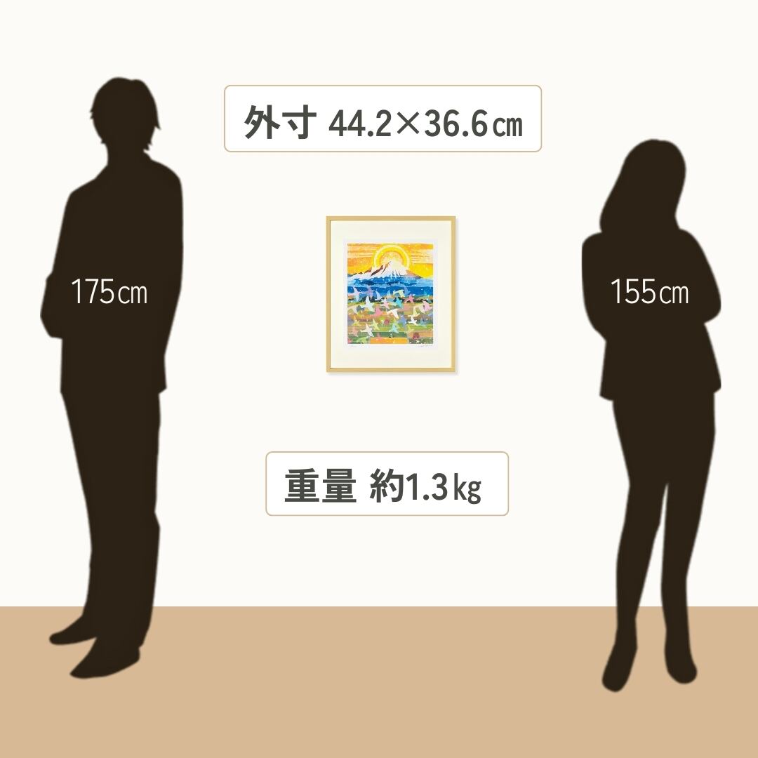 この作品は、明るいオレンジとブルーのコントラストが空間を華やかに彩り、ポジティブなエネルギーをもたらします。玄関やリビングに飾ると、毎日を前向きに過ごすための励ましのような存在に。風水的にも「朝日」「山」「鳥」は運気上昇や開運の象徴とされ、飾るだけで心地よい気の流れを生み出します。ナチュラルインテリアやモダンな空間にもよく馴染み、空間に希望と活力を与えるアートです。
