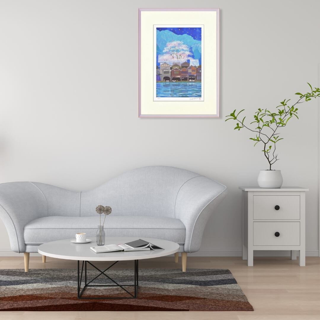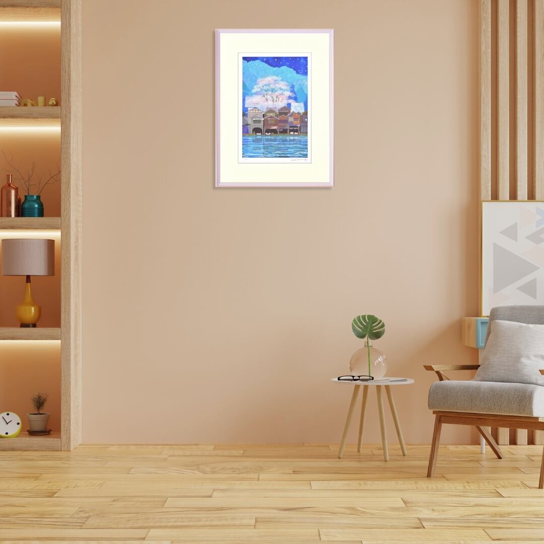 静かな夜の海辺に佇む京都・伊根の舟屋を、満開の桜とともに描いた幻想的なアート作品です。群青の夜空に輝く星々と、柔らかく光る桜の花が織りなす情景は、現実と夢のあわいを思わせるような美しさ。水面に映る灯りと花びらの反射が、穏やかな時間の流れを感じさせます。古き良き日本の情景をモダンな色彩で表現したこの風景画は、懐かしさと静謐さを併せ持つ作品。夜桜の儚い輝きを、アートとして永遠に留めた一枚です。