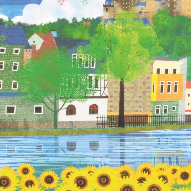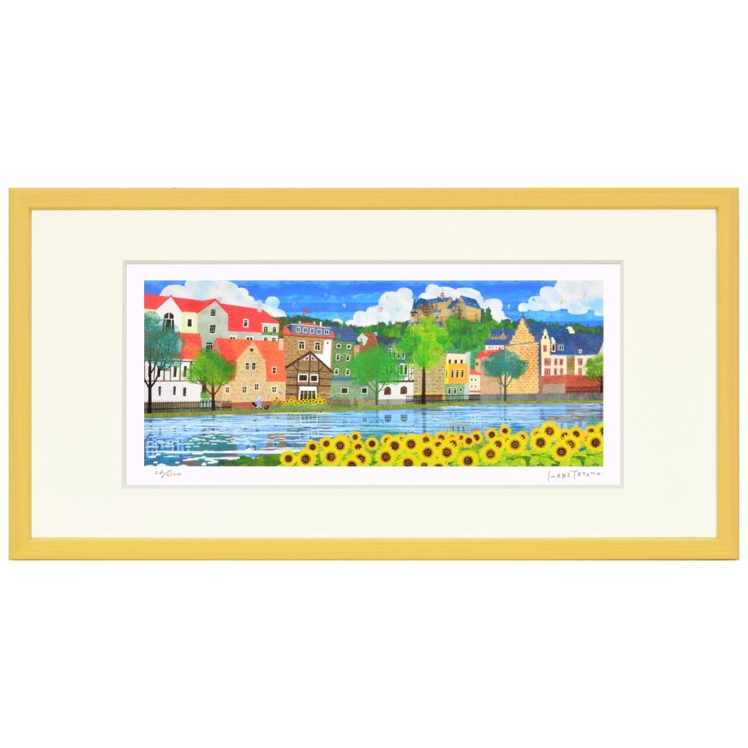 夏の陽射しに輝くドイツの古都マールブルクを舞台に描かれた、鮮やかで生命感あふれるアート作品です。赤い屋根の家並みと、丘の上にそびえるお城が美しく調和し、前景には満開のひまわりが咲き誇ります。青空の下、穏やかな川面が光を映し、まるで風が通り抜けるような爽やかさを感じさせます。夏特有の明るさと透明感を巧みに表現したこの作品は、見る人の心を明るく照らし、旅情と幸福感を呼び覚ます一枚です。