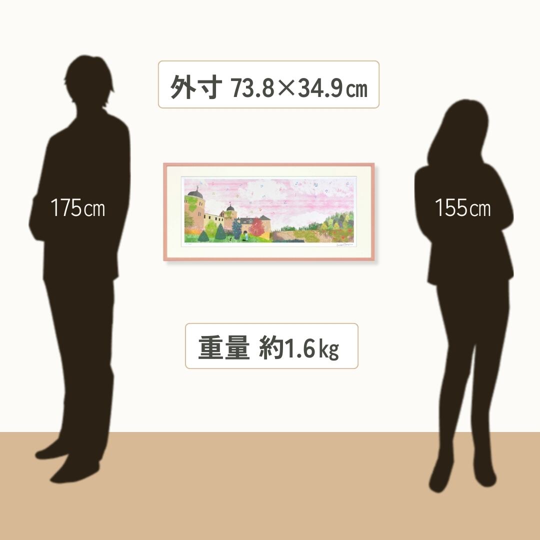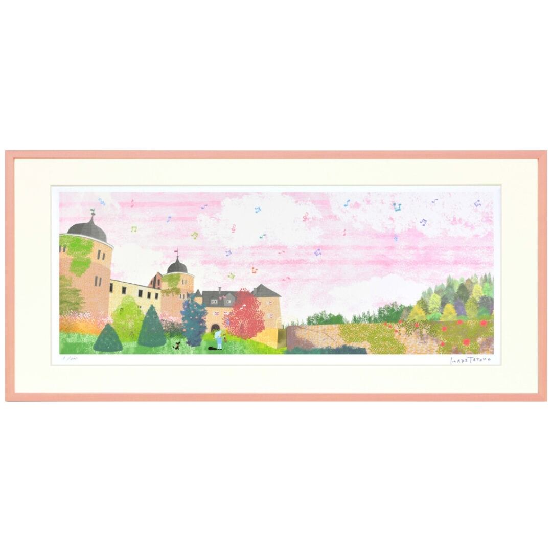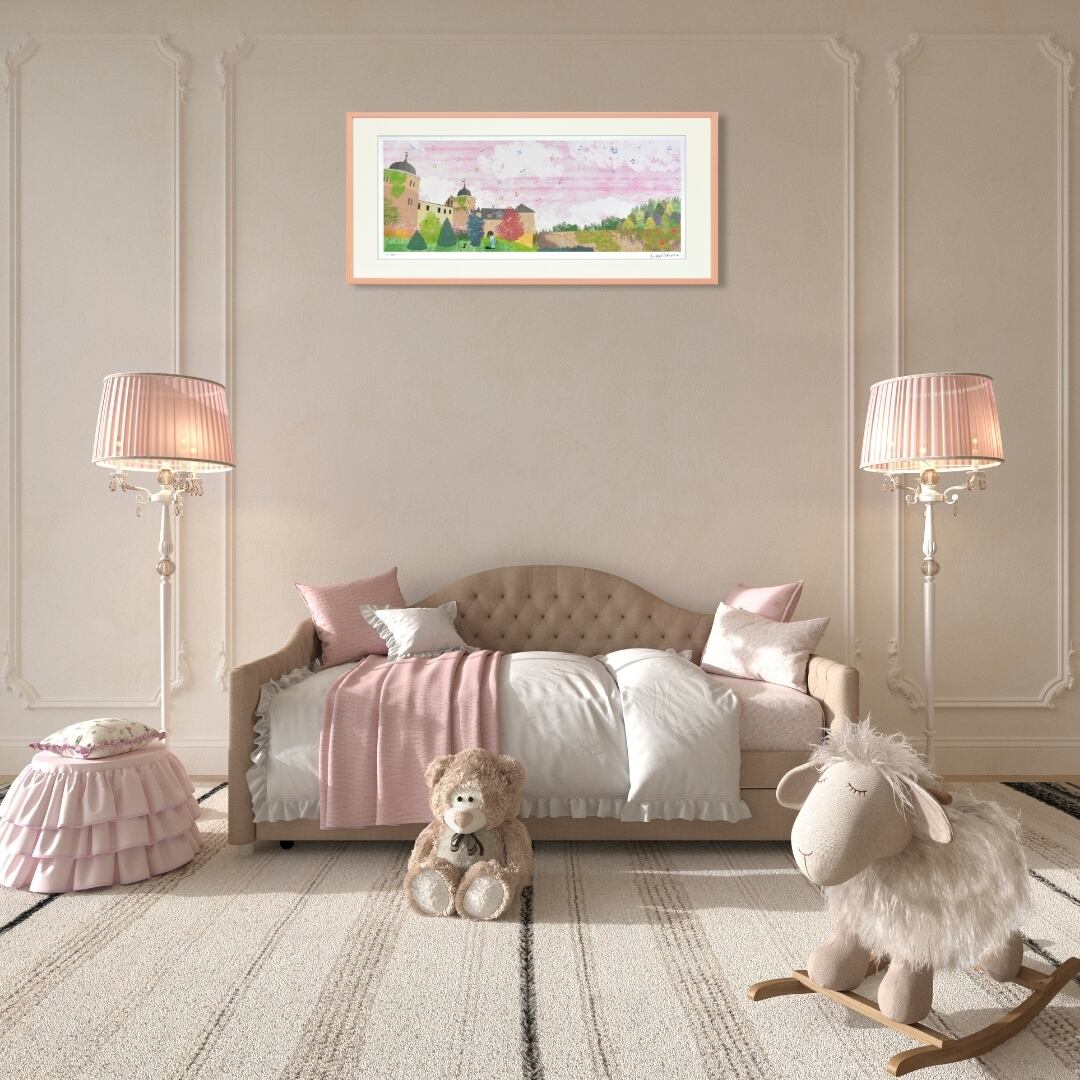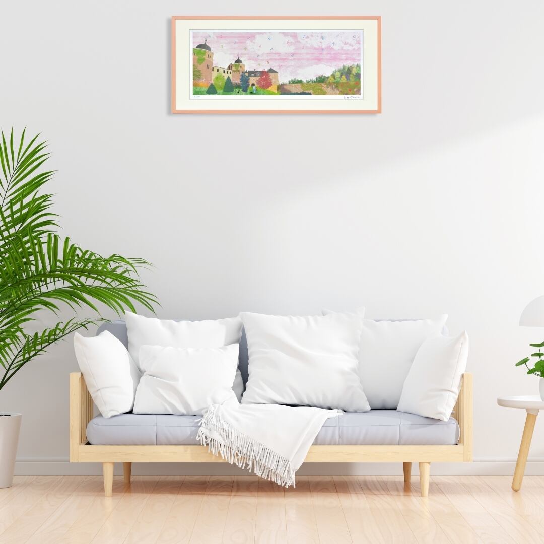 優しいピンク色のフレームが作品の柔らかな印象を引き立て、壁面に温かみを添えます。横長の構図が空間に広がりを生み、リビングや寝室、玄関などにも自然に馴染む上品なデザインです。落ち着いたトーンの中に華やかさもあり、飾るだけで部屋の雰囲気が明るくなります。眺めるたびに心が安らぎ、まるで物語の中に迷い込んだようなやさしい時間を感じさせるアートです。