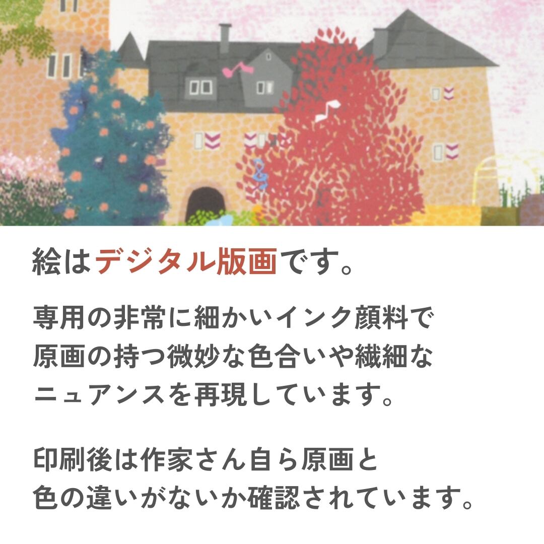 あたたかな世界と美しい色彩で店舗やご家庭のインテリアアートとしてピッタリ。