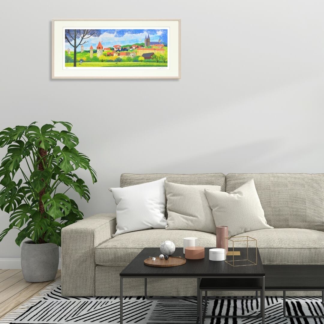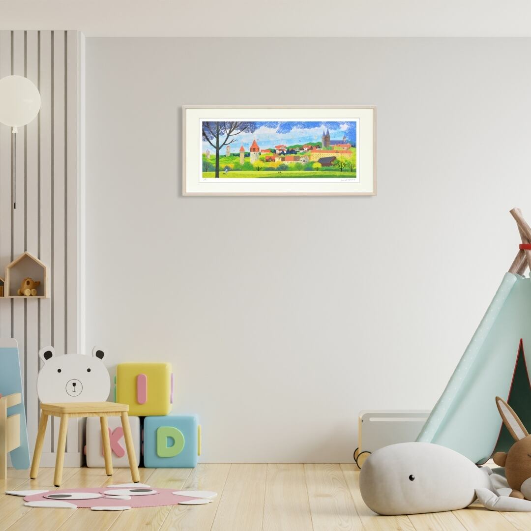 ドイツの小さな町、フリッツラー。緑の丘の上に赤い屋根の家々が並び、古い見張り塔が静かに街を見守っています。澄み渡る青空のもと、春の風が木々を揺らし、野の花がそっと色を添えています。のどかな草原を散歩する人と犬の姿が描かれ、時間の流れがゆっくりと感じられる光景です。遠くから聞こえる鐘の音や鳥の声までも聴こえてくるような、穏やかで心あたたまる一枚。光と風が織りなす、平和な午後の情景が広がります。
