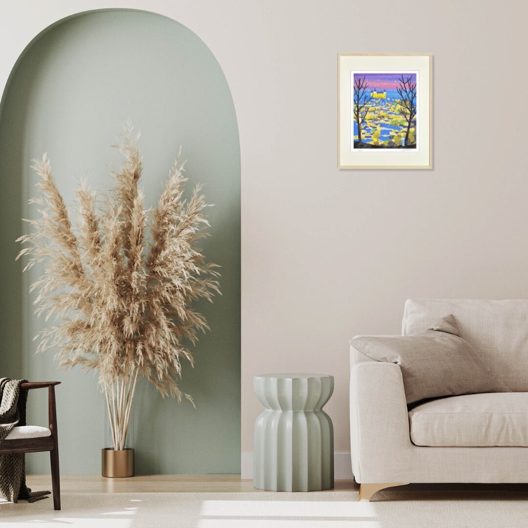 黄と青を基調とした柔らかな光のコントラストが、インテリアに深い落ち着きをもたらします。夕暮れの情緒とともに、見る人の心を穏やかに包み込む作品です。