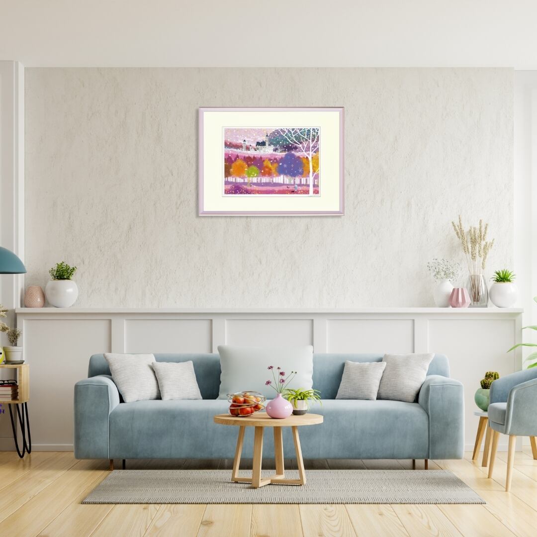 また、白い額装が作品の繊細な光を引き立て、インテリアのアクセントとしても高い存在感を放ちます。