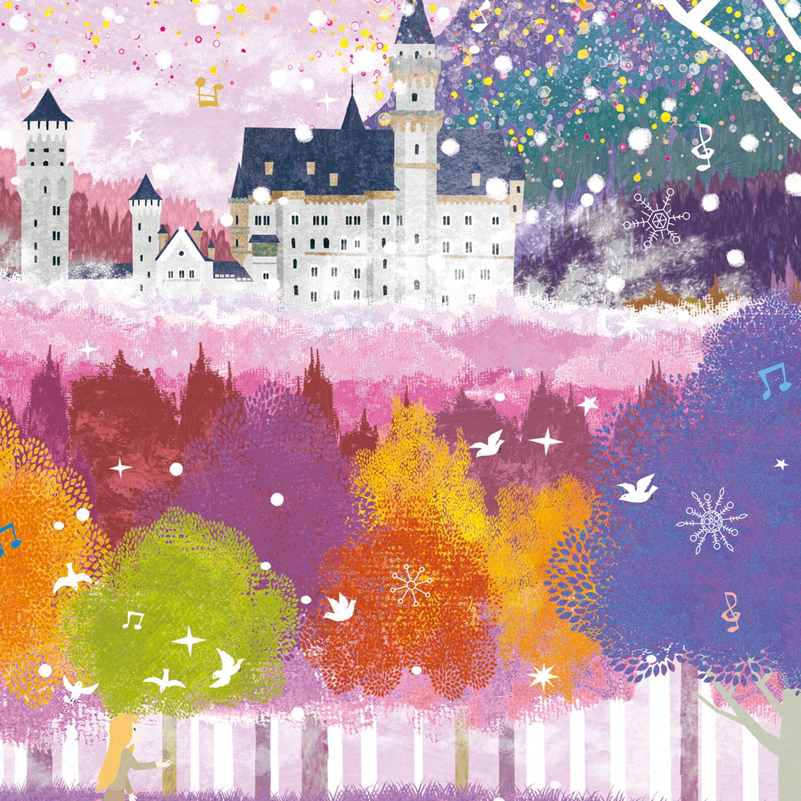 ドイツ・バイエルンの森に佇むノイシュヴァンシュタイン城を、夢のような色彩で描いた作品です。