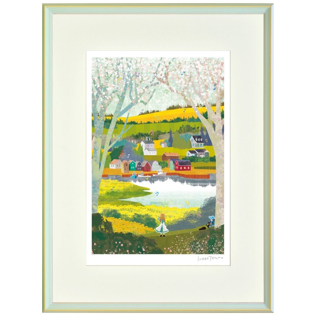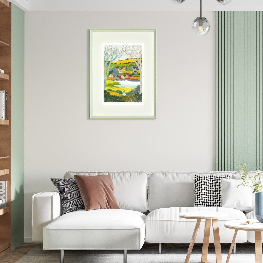 柔らかな陽ざしに包まれた丘の上に、小さな家々が並ぶ穏やかな村の風景が広がり、その前には黄色い花畑と静かな湖がきらめくように描かれたアートです。明るい緑とやさしい黄色が調和し、のどかな春の日の空気が伝わってくるような心地よさがあります。木々の枝越しに見える風景は、どこか懐かしさと希望を感じさせ、遠くに続く丘の奥行きが、時間の流れを静かに感じさせてくれます。自然の豊かさと人の暮らしの温もりが見事に溶け合い、眺めるたびに心がやさしく満たされる作品です。