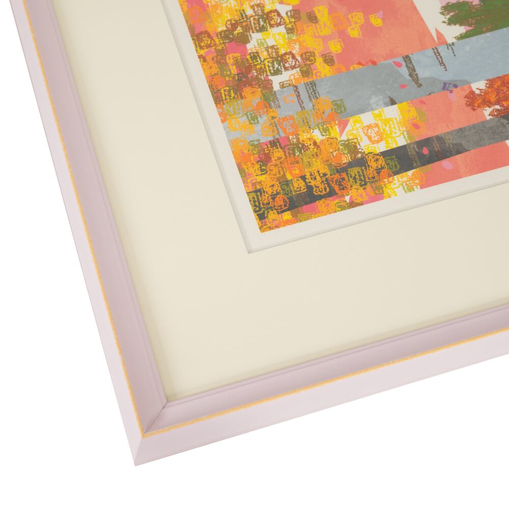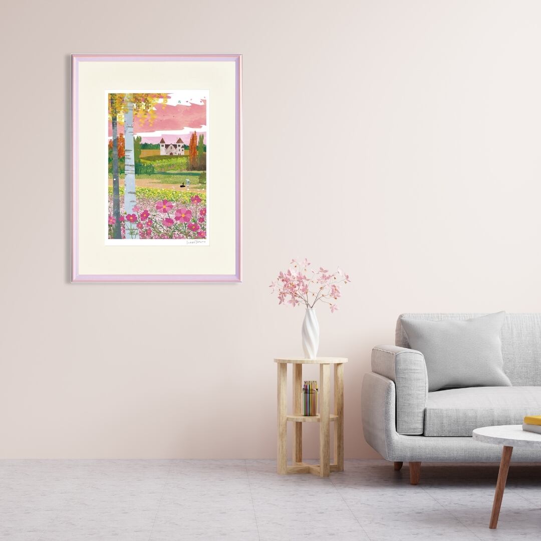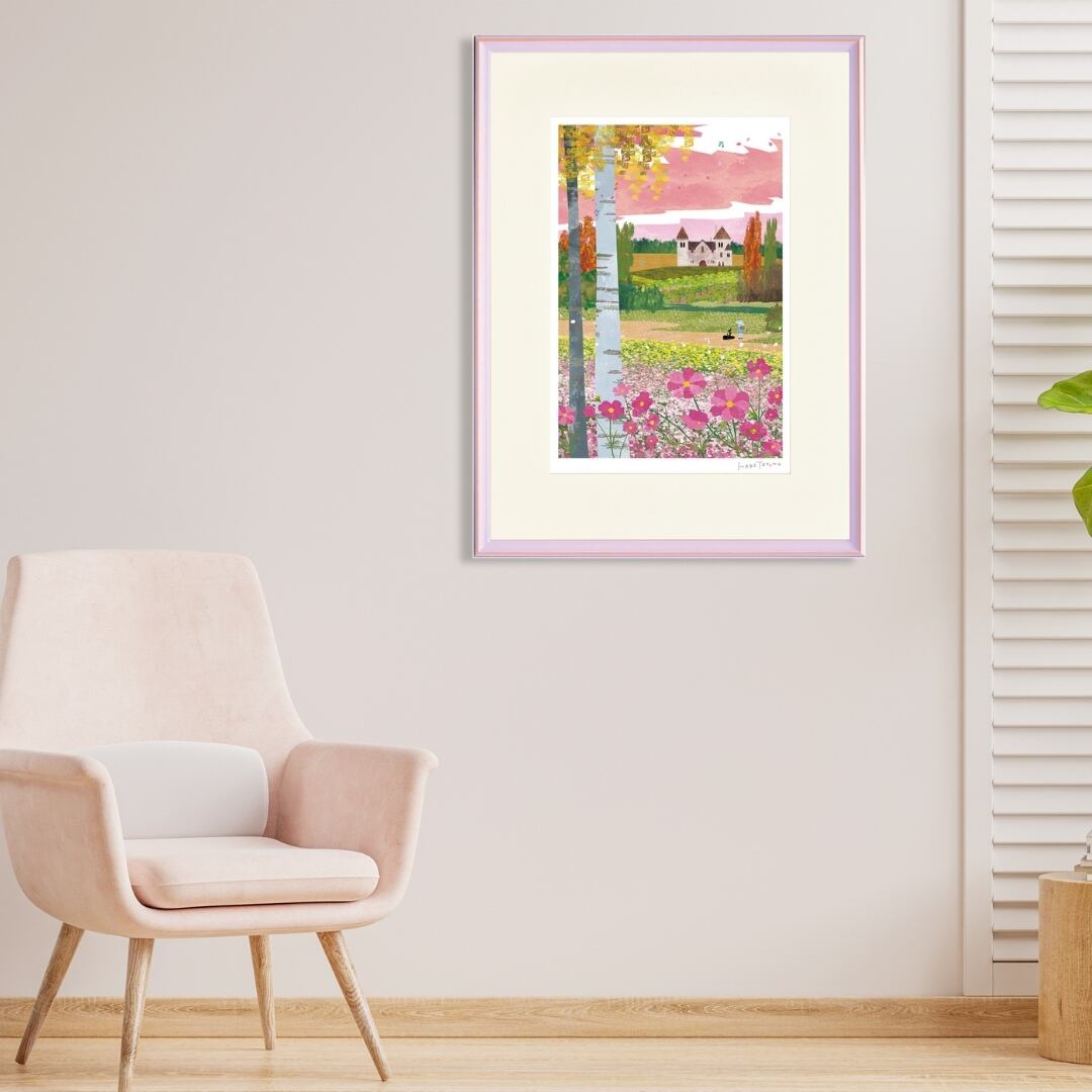 柔らかなピンクの空とコスモスの花畑が広がる、フランス・ブルゴーニュ地方の穏やかな風景を描いたインテリアアートです。黄金色の葉をつけた木々と、遠くに佇む白いシャトーが美しく調和し、まるで童話のワンシーンのような世界観が広がります。自然の色彩が織りなすグラデーションと、そよ風を感じさせるタッチが印象的で、見る人の心をやさしく包み込みます。日常の中にふと訪れる静かな幸福を描いたような、詩情あふれる作品です。