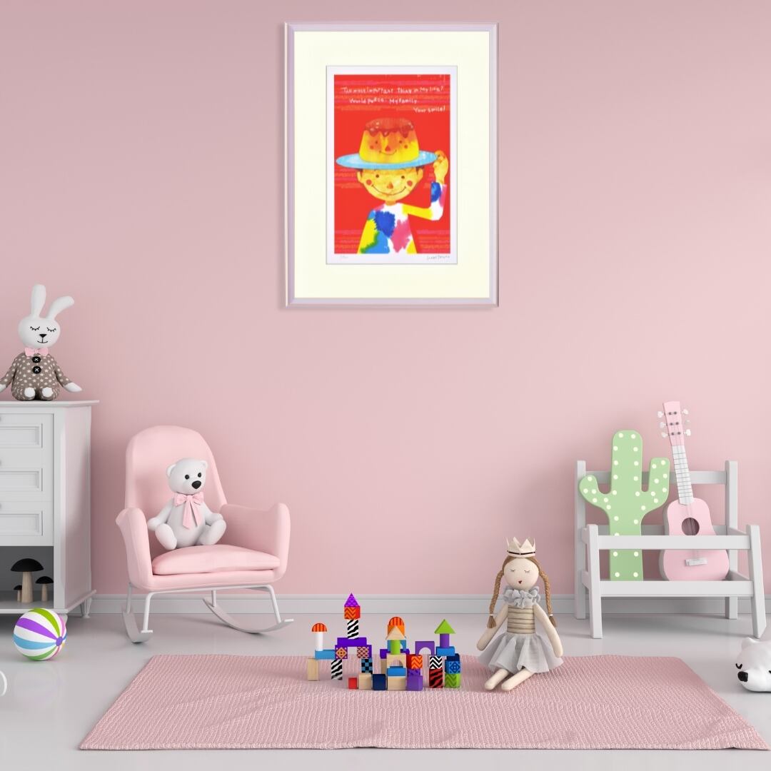 鮮やかな赤とポップなモチーフが印象的なこのインテリアアートは、空間にエネルギーと明るさをもたらします。白壁やナチュラルカラーのインテリアと合わせることで、アートの色彩が一層際立ち、現代的で心弾む雰囲気を演出します。リビングや子ども部屋、カフェなどに飾れば、訪れる人々に自然と笑顔を生むような温かい空間に。アートを通して、日常に遊び心とポジティブなエネルギーを添える、見るたびに元気をもらえる作品です。