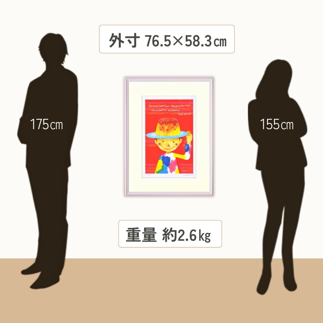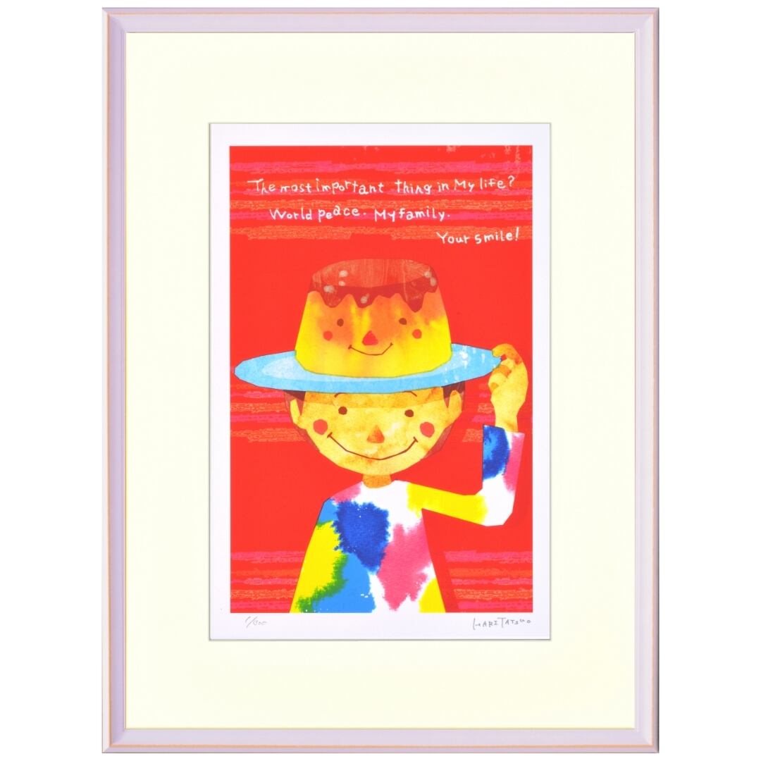 明るくポップな色彩が印象的なアート作品「プリンハット」。帽子のようにプリンをかぶった少年の笑顔が、見る人の心をほっと温めます。シンプルながら大胆な構図と鮮やかな色使いが、童心のような純粋さと楽しさを感じさせる作品です。背景の赤とキャラクターの柔らかなトーンが絶妙なコントラストを生み、元気と優しさが同居する独特の世界観を表現しています。モダンアートとしての魅力と、ユーモアあふれるタッチが融合したこの作品は、空間を明るく照らすような存在感を放ちます。