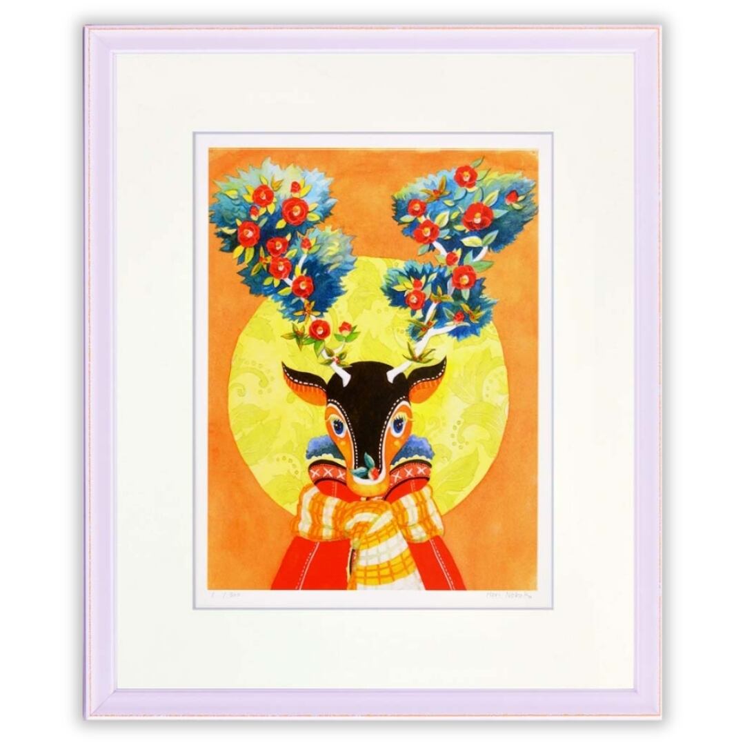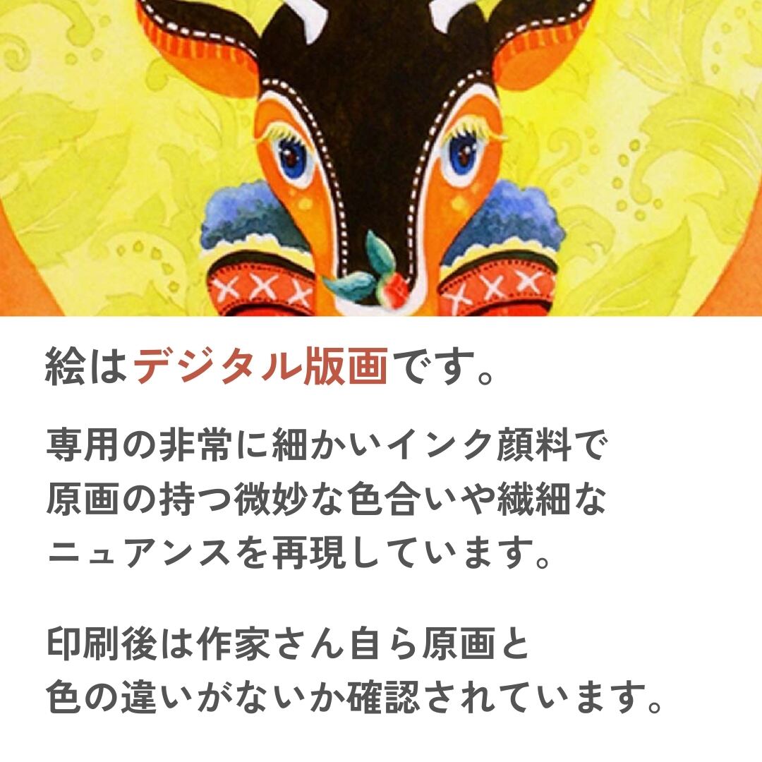 華やかな色彩と愛らしい表情が印象的なこのイラストは、お部屋を明るく彩るインテリアアートとして最適です。角に咲いた花が独特のアクセントとなり、リビングや玄関に飾れば空間に華やぎと温かさをもたらします。優しいタッチで描かれたアートは、子ども部屋やカフェなどにもよく似合い、訪れる人にやさしい印象を与えます。額入りアートとして完成された作品なので、届いたその日から手軽に飾って楽しめます。