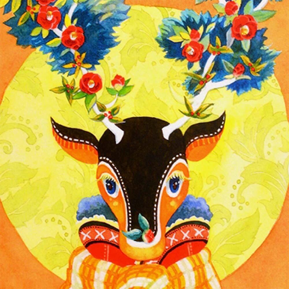 柔らかなオレンジ色の背景に、鹿の姿が鮮やかに描かれています。大きな目を持つ鹿は可愛らしさと神秘性を兼ね備え、角には青々とした葉と赤い椿が咲き誇り、豊かさや生命力を象徴しているようです。首元には赤と黄色のマフラーが巻かれ、冬の温もりを感じさせます。全体の配色は華やかでありながら調和があり、童話の挿絵のように夢のある世界観を広げるアートです。
