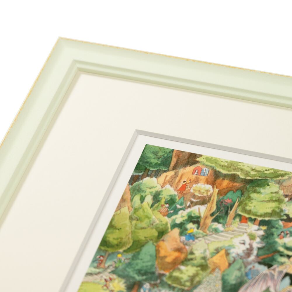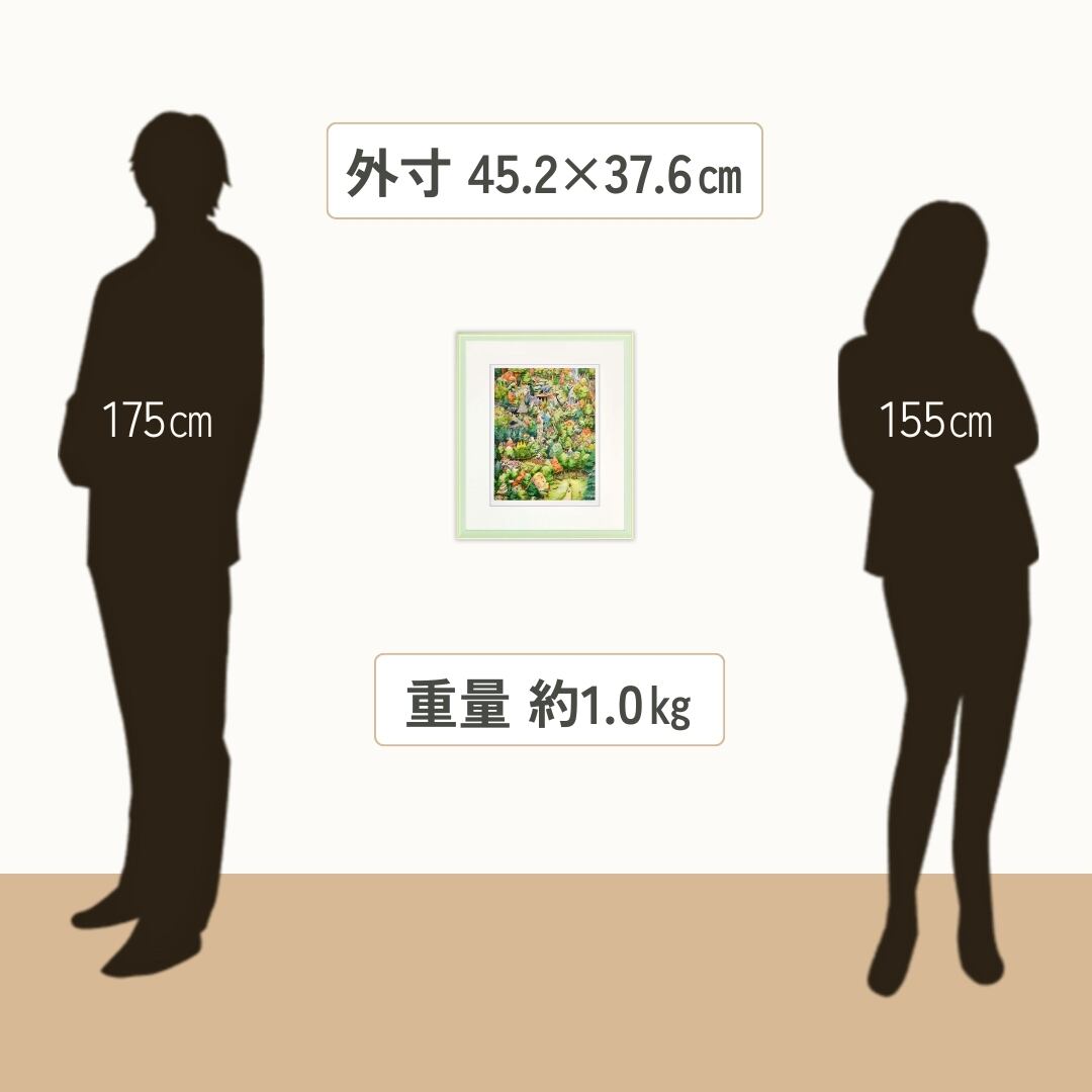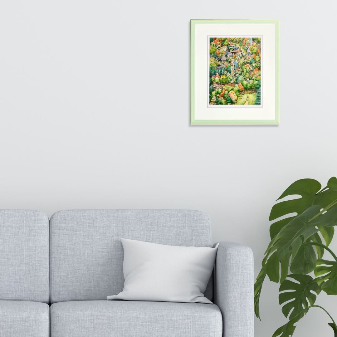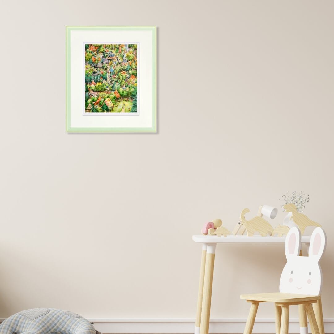 緻密な描写と鮮やかな色彩が魅力のイラストは、眺めるたびに新しい発見をもたらしてくれるインテリアアートです。壁に掛ければ物語性のある空間が生まれ、リビングや書斎を温かく包み込む雰囲気に変えてくれます。細部に描かれた動物や家々は心を和ませ、来客との会話のきっかけにもなるでしょう。額入りアートとしてそのまま飾れる完成度があり、日常に彩りと奥行きを加えるアイテムとして長く楽しめます。