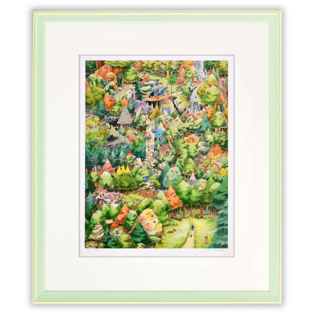 深い森の奥へと続く道を描いたこのアートは、まるで「行く~森~」という言葉そのものの世界観を体現しています。緑豊かな木々や小さな家々が重なり合い、見る人を物語の舞台へと誘うような温かな情景が広がります。鮮やかな彩色と緻密な筆致は、自然の息づかいを感じさせるだけでなく、冒険心や懐かしさを呼び覚まします。絵の前に立つと、森の小道を進む旅人の気持ちになり、日常を忘れて心が解き放たれるような不思議な魅力に包まれる作品です。