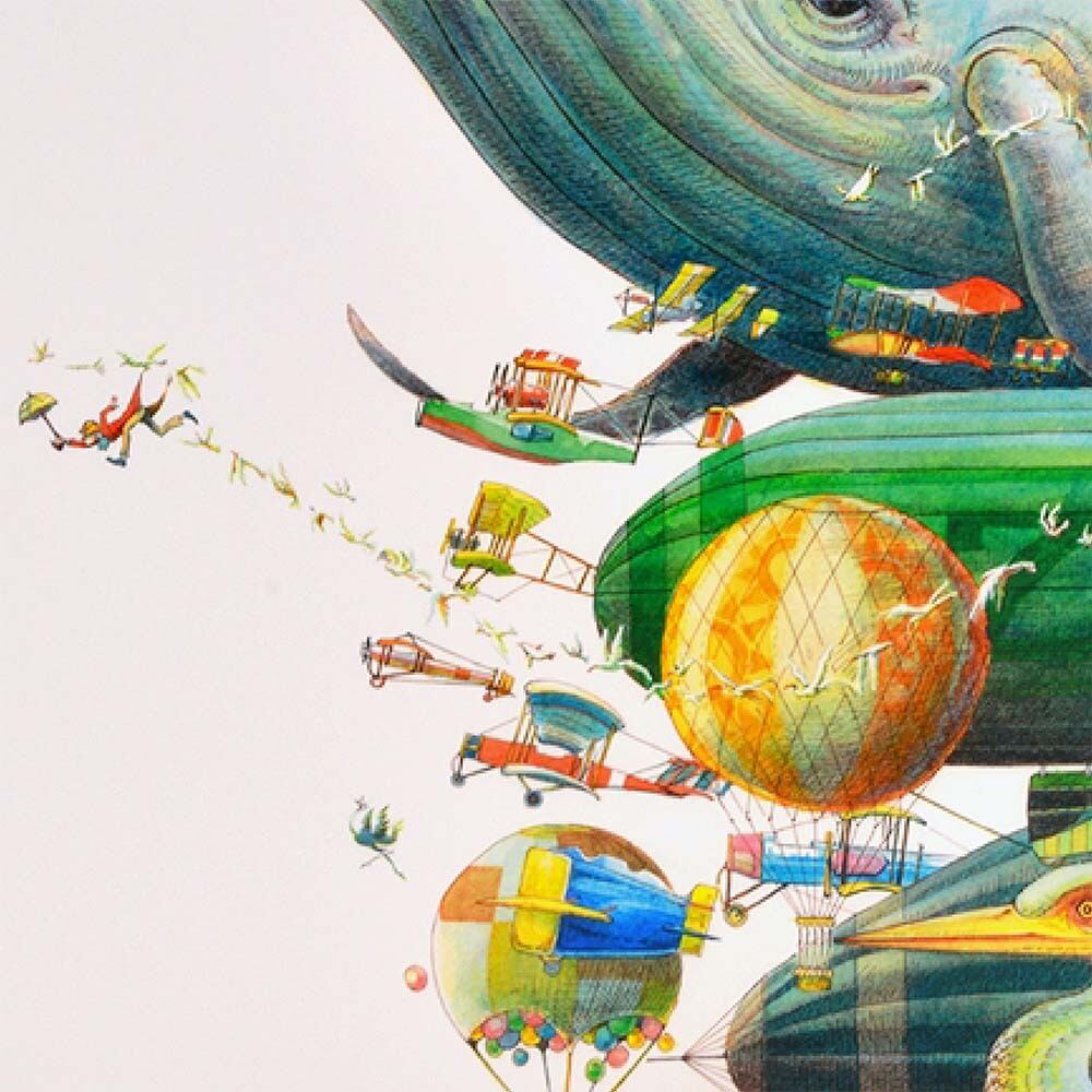 大きな鯨が悠然と姿を現し、その周囲には飛行機や気球が舞い踊る幻想的な情景が広がります。色鮮やかな乗り物や鳥たちが織りなす光景は、まるで「航路は霞」とも言えるような、現実と夢の狭間を漂うような雰囲気を感じさせます。細部まで描き込まれた表現は、見る人を物語世界に誘い込み、眺めるたびに新たな冒険が始まるような高揚感を与えてくれます。空想の航路を旅するようなワクワク感が詰まったイラスト作品です。