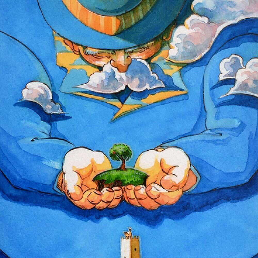 青い衣をまとった大きな存在が、両手に小さな島を優しく抱えている姿が印象的です。そこには一本の木が力強く立ち、まるで未来への希望を託す「贈り物」のように描かれています。眼差しには深い慈しみが宿り、空や雲までもがその存在の一部となって画面を満たしています。絵全体から伝わるのは、自然と人とのつながり、そして守られることの安心感。タイトルを思わせるような「ギフト」のイメージが、見る人の心に温かく響く作品です。