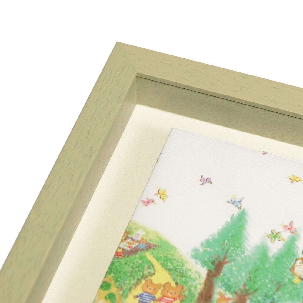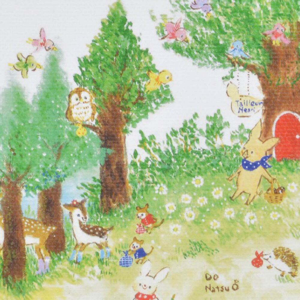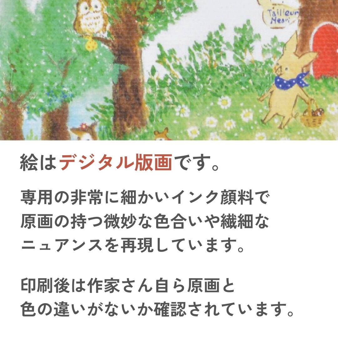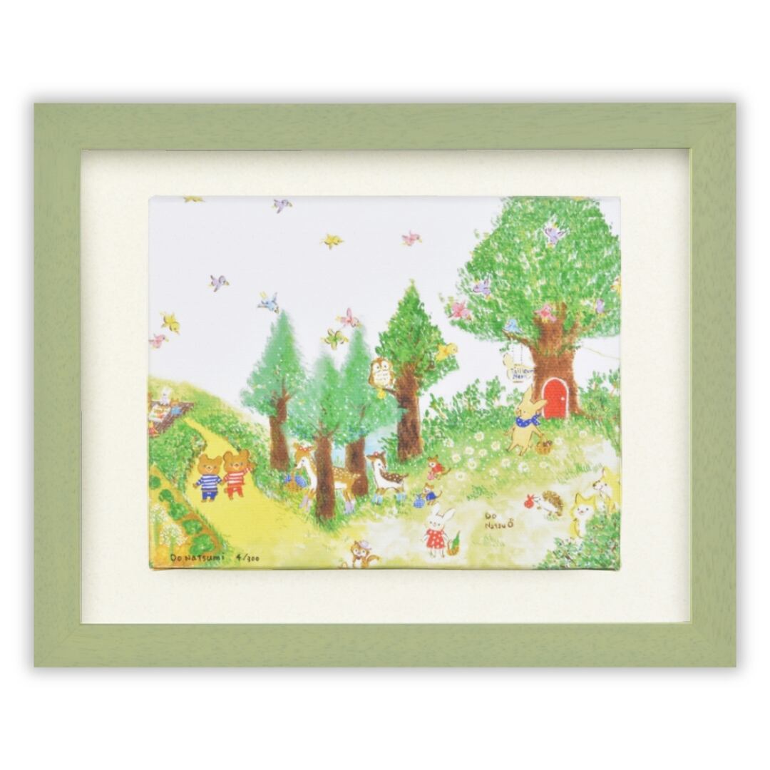 やわらかな緑に包まれた森の中で、動物たちがのびのびと過ごす穏やかな風景を描いたキャンバスアート作品です。木々のあいだから差し込む光や、空を舞う小鳥たちが、まるで絵本の世界を思わせるような癒しのアートとなっています。印刷は立体的なキャンバス地に施されており、表面にはキャンバス独特の質感が感じられます。光の当たり方によって陰影が変化し、まるで原画のような奥行きを表現。小さな動物たちのかわいい姿が、見る人の心を優しく包み込むような、温もりあふれる一枚です。
