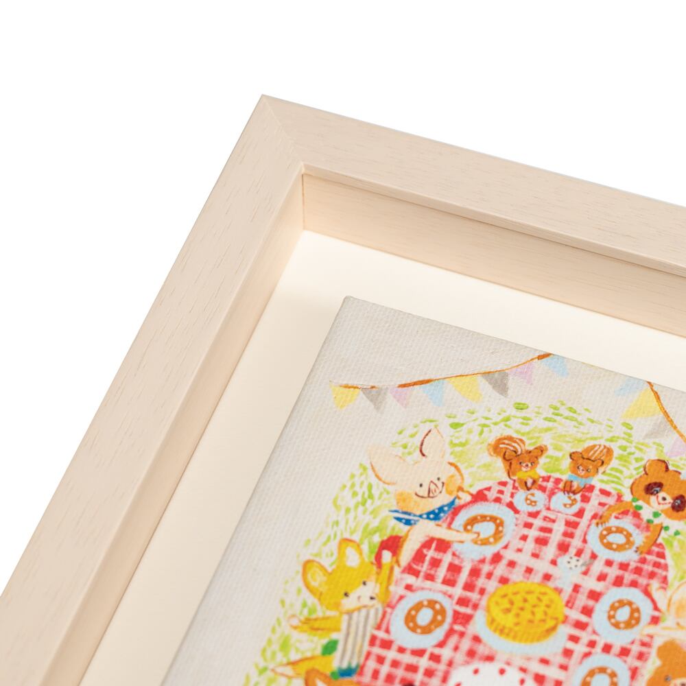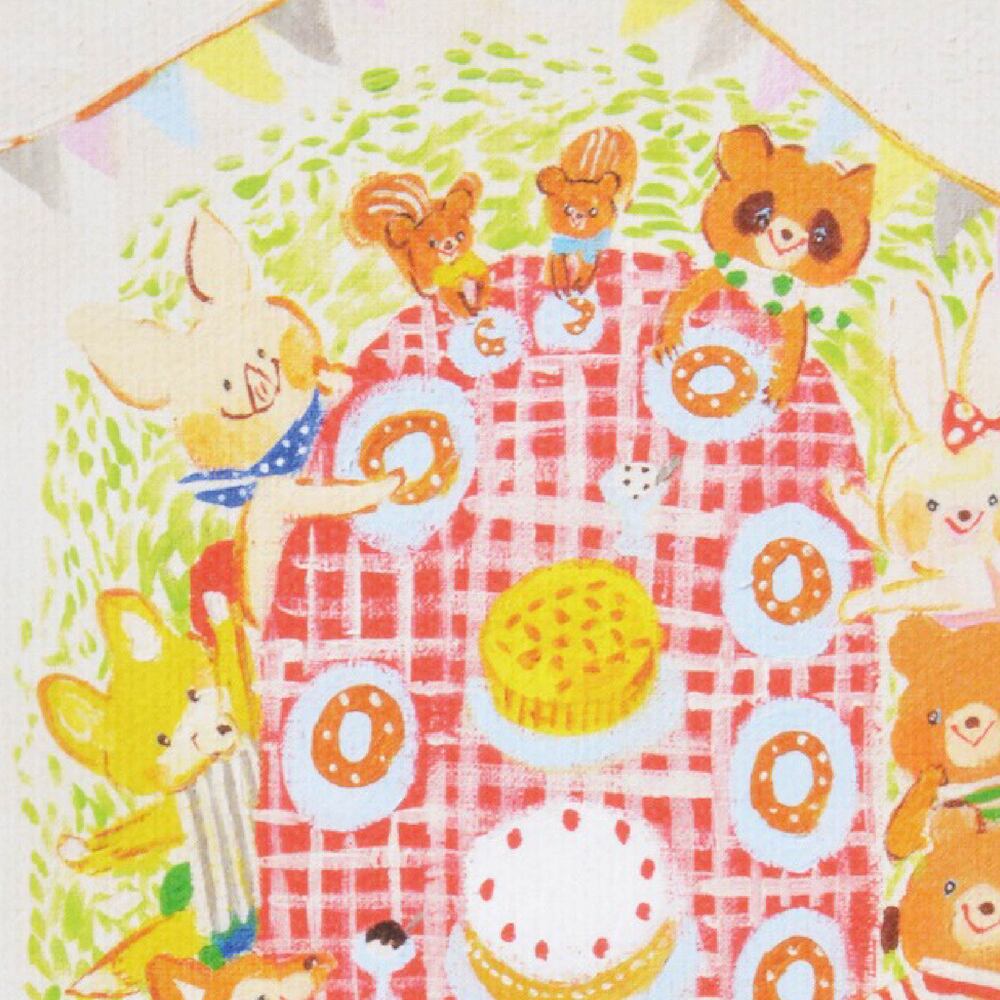 楽しい笑い声が聞こえてきそうな、森の仲間たちのパーティーシーンを描いたキャンバスアートです。赤いギンガムチェックのテーブルクロスに並ぶケーキやお皿、動物たちの表情があたたかく、見ているだけで幸せな気持ちに包まれます。立体的なキャンバスに印刷されているため、表面にはキャンバス特有の凹凸とマットな質感があり、絵に深みと存在感を与えています。まるで絵本のページを切り取ったような世界観が、子ども部屋やリビングを優しく彩ります。