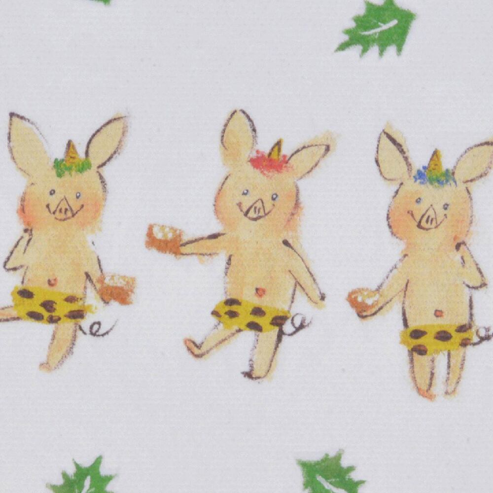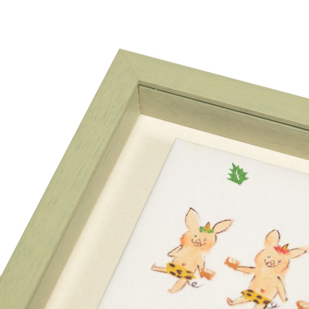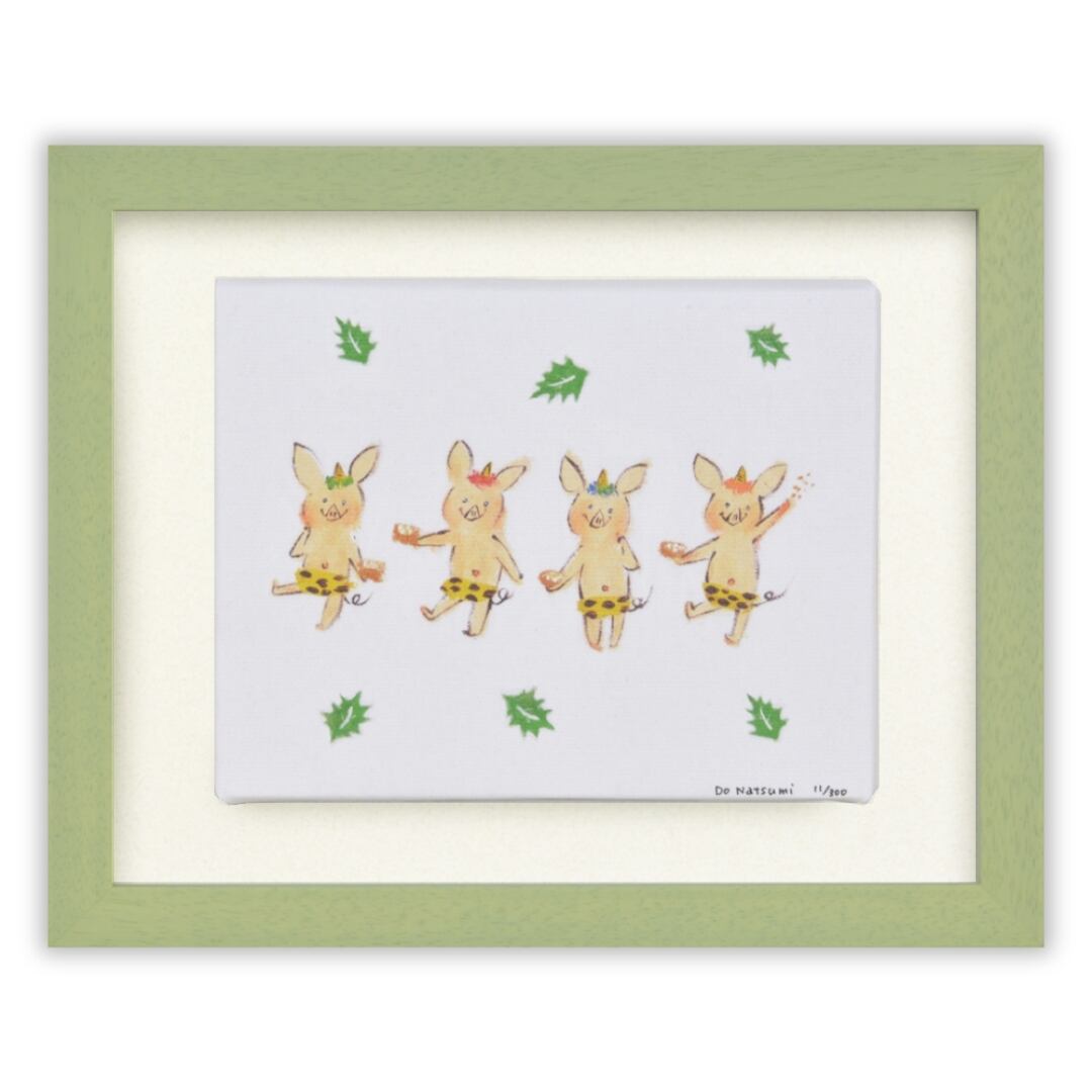 4匹の子ブタたちが楽しそうに豆まきをしている可愛らしい「節分」のワンシーンを描いたアートです。柔らかなタッチと淡い色彩で表現された動物たちは、見ているだけで心が和むような優しい世界観。節分の豆まきという日本らしいテーマを、ほのぼのとしたユーモアで表現しています。背景にはグリーンの葉が舞い、春の訪れを感じさせる明るい雰囲気。紙ではなくキャンバス地に印刷されたインテリアアートのため、表面の織り目が生む立体感が魅力で、どの角度から見ても温もりを感じる一枚です。