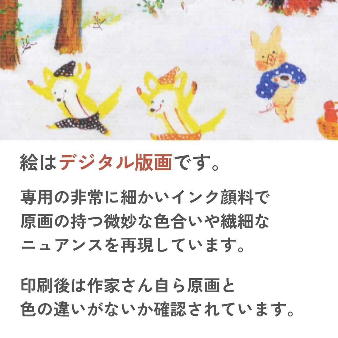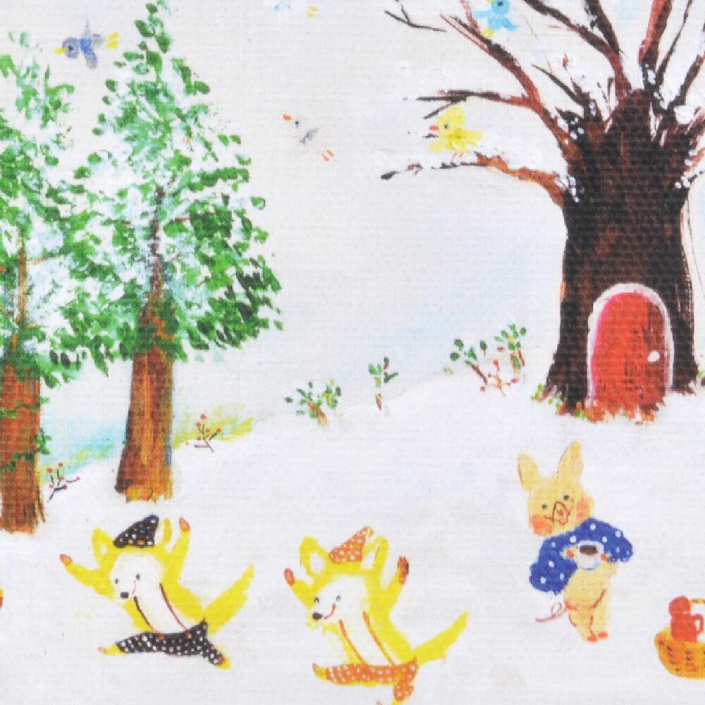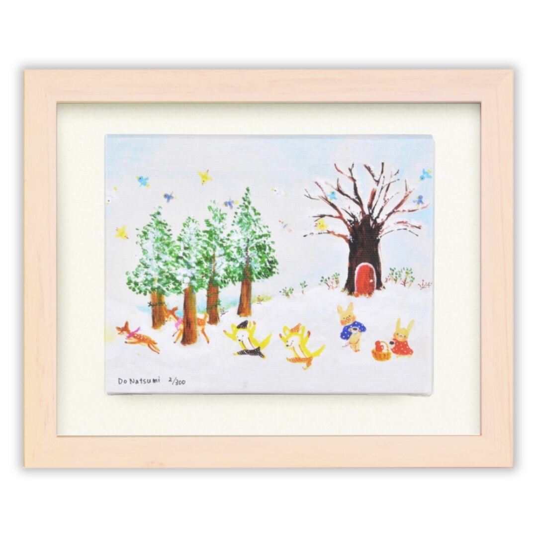 雪に包まれた静かな森で動物たちが楽しく過ごす様子を描いたアートです。真っ白な雪の上に広がる色とりどりの動物たちの姿は、冬の寒さの中にもぬくもりを感じさせます。小さなウサギやシカたちが舞うように動き回り、遠くの木のドアが幻想的な物語を想起させます。紙ではなくキャンバス地に印刷されたインテリアアートのため、表面に浮かぶ独特の質感がやわらかな陰影を生み、まるで本物の筆で描かれたような立体感が魅力です。