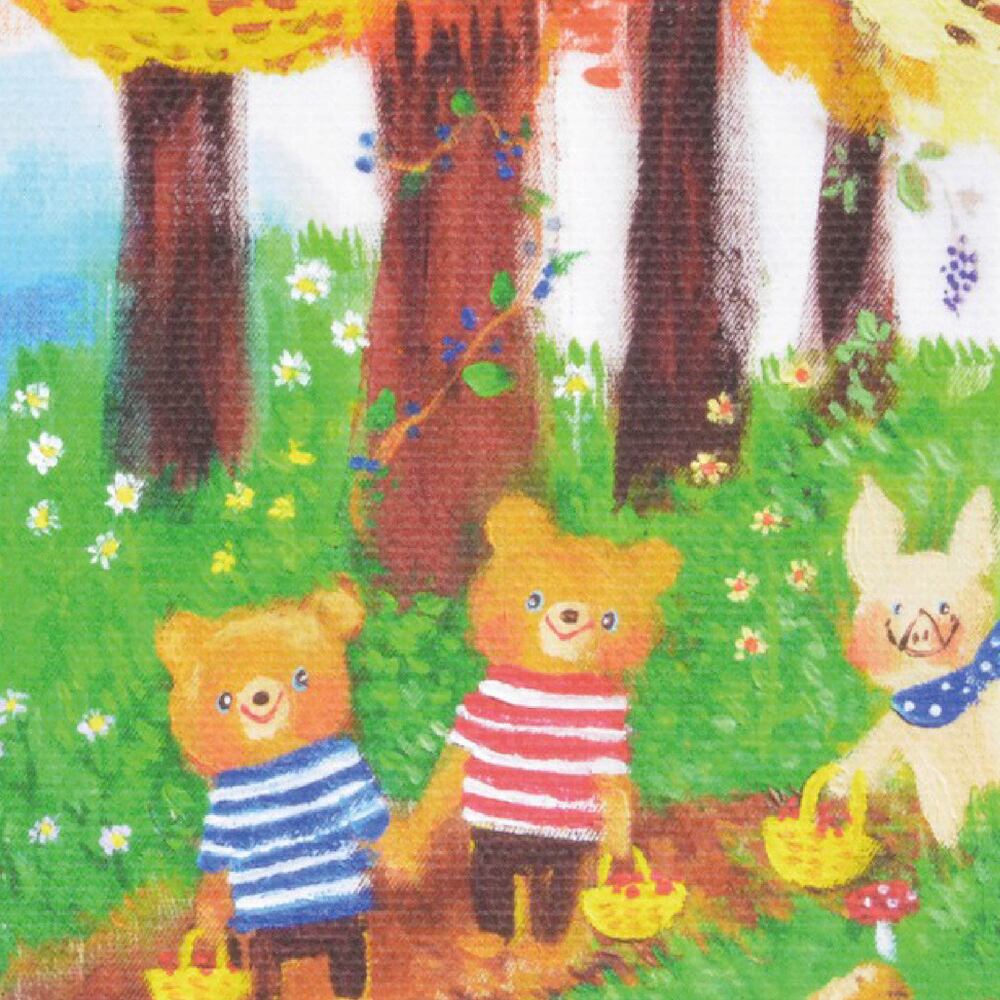 あたたかな秋の光に包まれた森の中を、かわいらしい動物たちが楽しく散歩しています。赤や黄色に色づいた木々、足元に並ぶキノコや花々が季節の豊かさを感じさせます。クマの親子やリス、フクロウたちが穏やかに共存する世界は、見ているだけで心が和みます。やわらかな筆のタッチが特徴的な動物アートで、紙ではなくキャンバスならではの質感が、木々のぬくもりや空気のやさしさをよりリアルに伝えています。自然の中に流れる時間を感じさせる一枚です。