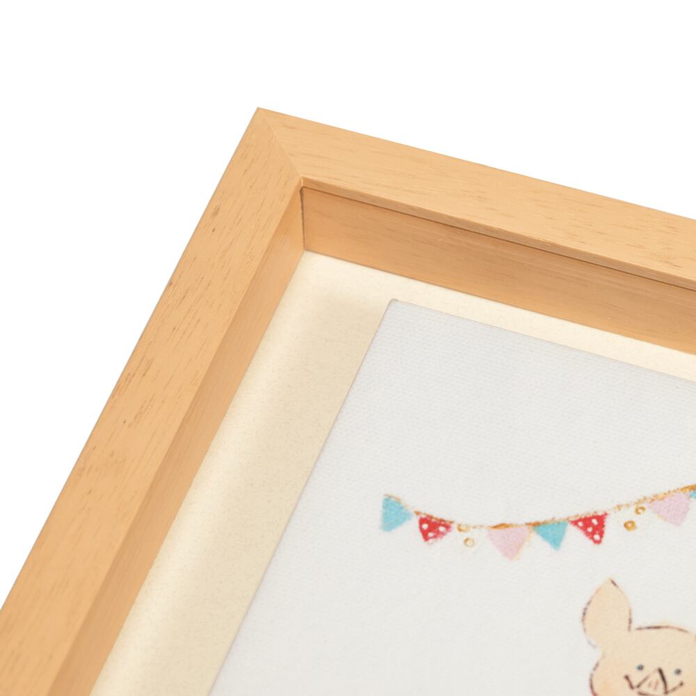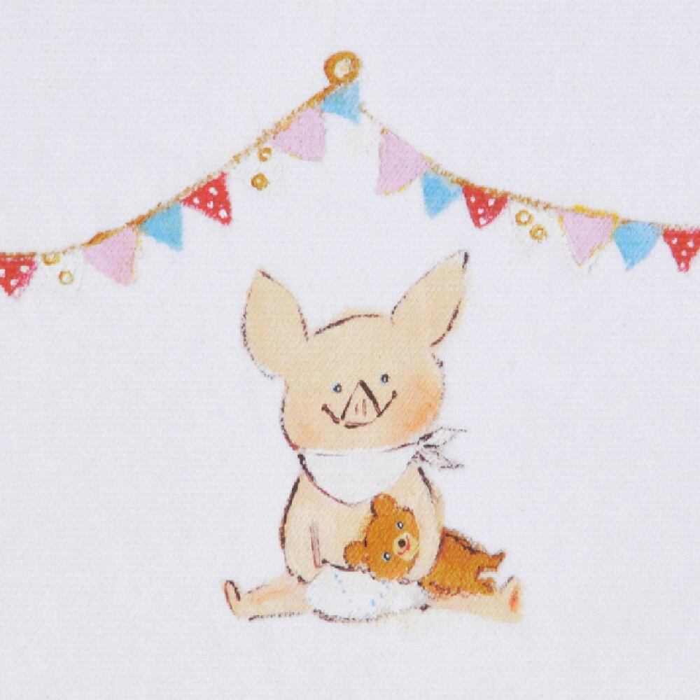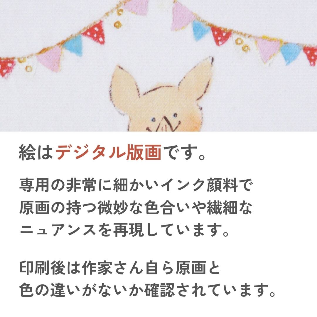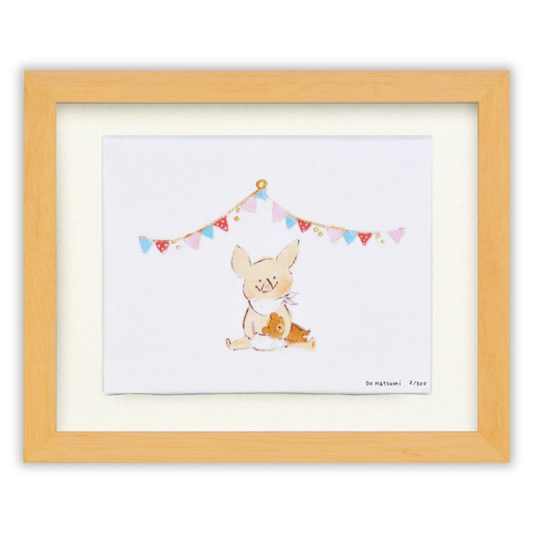 やわらかなタッチで描かれた子ブタが、ぬいぐるみを抱えて座る姿が愛らしい一枚です。背景には色とりどりのフラッグガーランドが飾られ、まるで小さなパーティーを開いているようなあたたかな空気が漂います。優しい色合いと繊細な筆づかいが特徴の動物アートで、シンプルながらも見る人の心を和ませる魅力があります。キャンバス地ならではの立体的な質感が、絵のやさしい世界観をより一層引き立てています。手描きのぬくもりと柔らかな雰囲気が調和した、穏やかで癒しに満ちたキャンバスアートです。