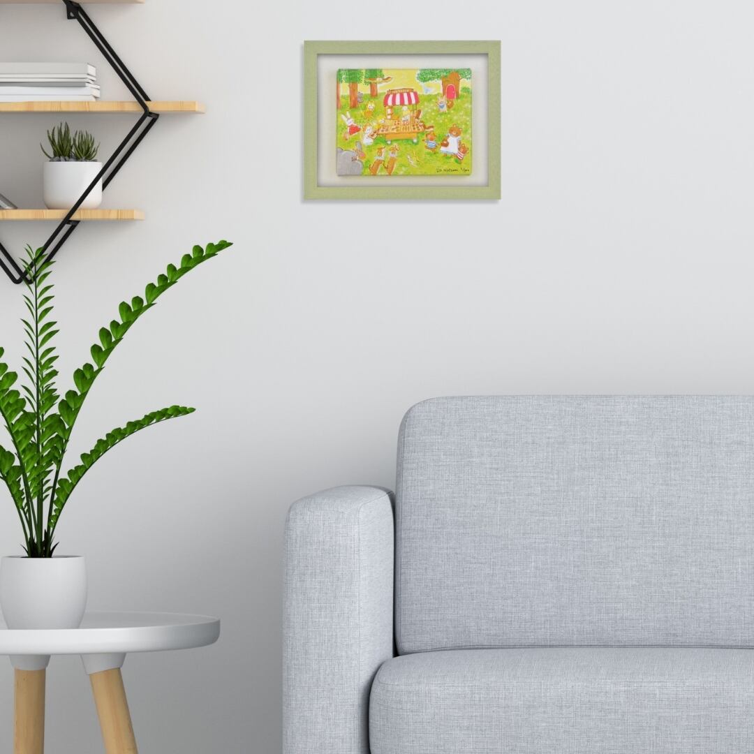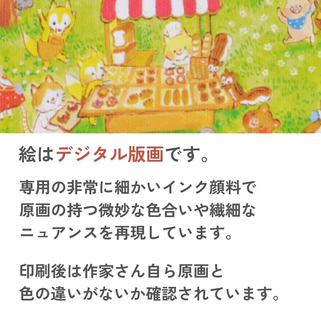 明るい森の中、かわいらしい動物たちが集まるパン屋さんの風景が描かれています。赤い屋根の屋台には、焼きたてのパンがずらりと並び、猫の店主やうさぎ、くまなどが楽しそうに過ごしています。やわらかなタッチと鮮やかな色彩が心を温める動物アートで、どこか懐かしさを感じさせる穏やかな世界観が広がります。キャンバス地の表面には自然な凹凸があり、光の角度によって絵の印象がやさしく変化します。見る人の気持ちをほっとさせる魅力を持ったキャンバスアートです。