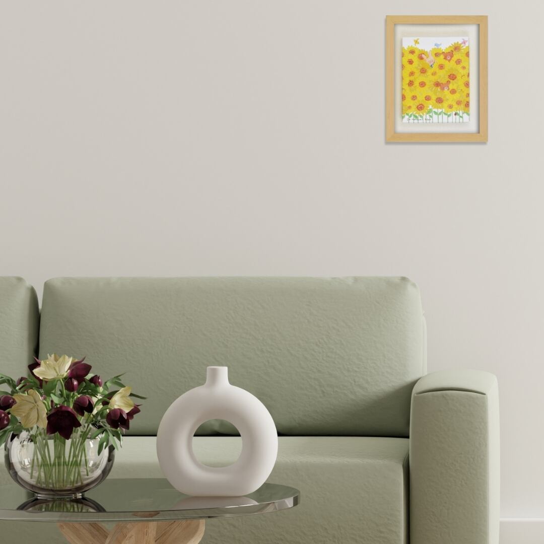 このインテリアアートは、飾るだけでお部屋の印象をパッと明るく変えてくれます。ひまわりの鮮やかな黄色はポジティブなエネルギーをもたらし、リビングや玄関、子ども部屋などにおすすめです。優しいタッチで描かれた動物たちが空間に癒しを添え、日々の生活に自然な笑顔を運んでくれます。木製フレームとキャンバスの素材感がナチュラルに溶け込み、シンプルなインテリアにもよく馴染むのが魅力。毎日の暮らしに明るさとぬくもりを与える癒しのアート作品です。