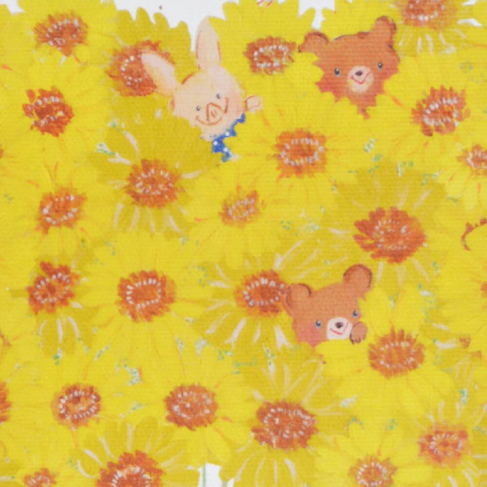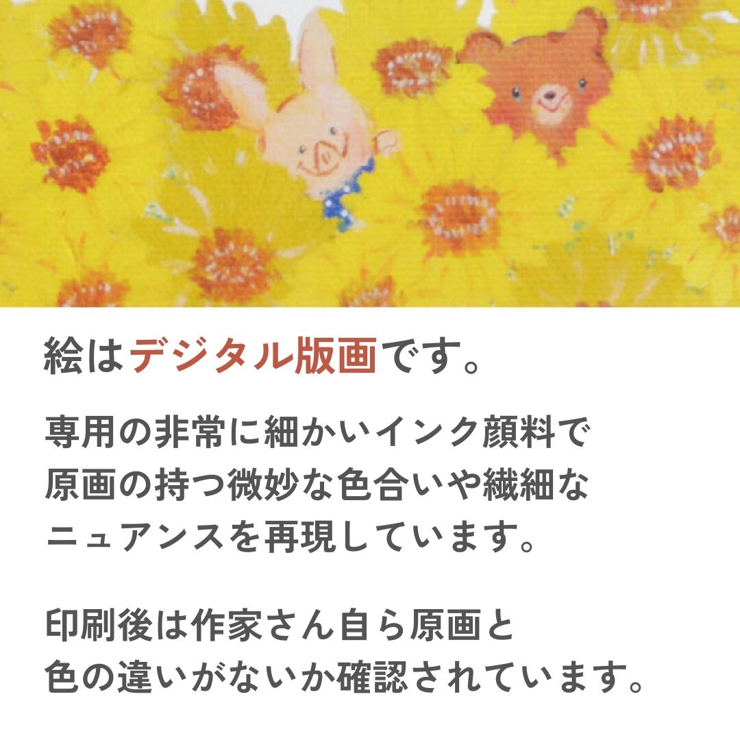 一面に広がるひまわり畑の中から、かわいらしい動物たちが顔をのぞかせています。うさぎやくまの笑顔が太陽のように明るく、見る人に元気を与えてくれるひまわりのアートです。黄色やオレンジのグラデーションが柔らかく重なり合い、絵全体にあたたかな光が満ちています。キャンバス地ならではの質感が生む立体感が特徴で、花びらの重なりや陽光のきらめきがリアルに感じられます。可愛らしいモチーフと明るい色彩が調和した、見るだけで気分が晴れるようなキャンバスアートです。
