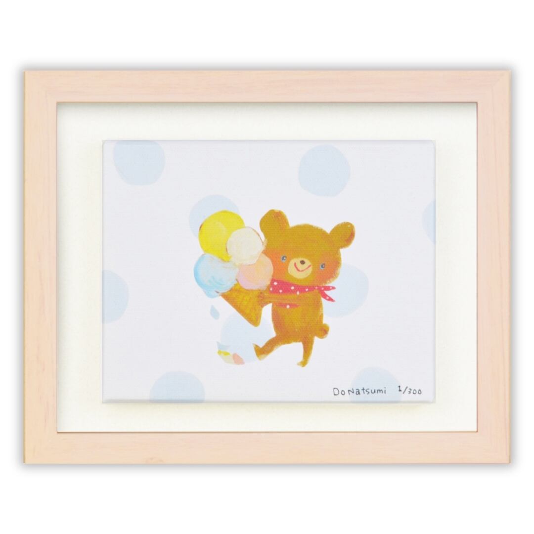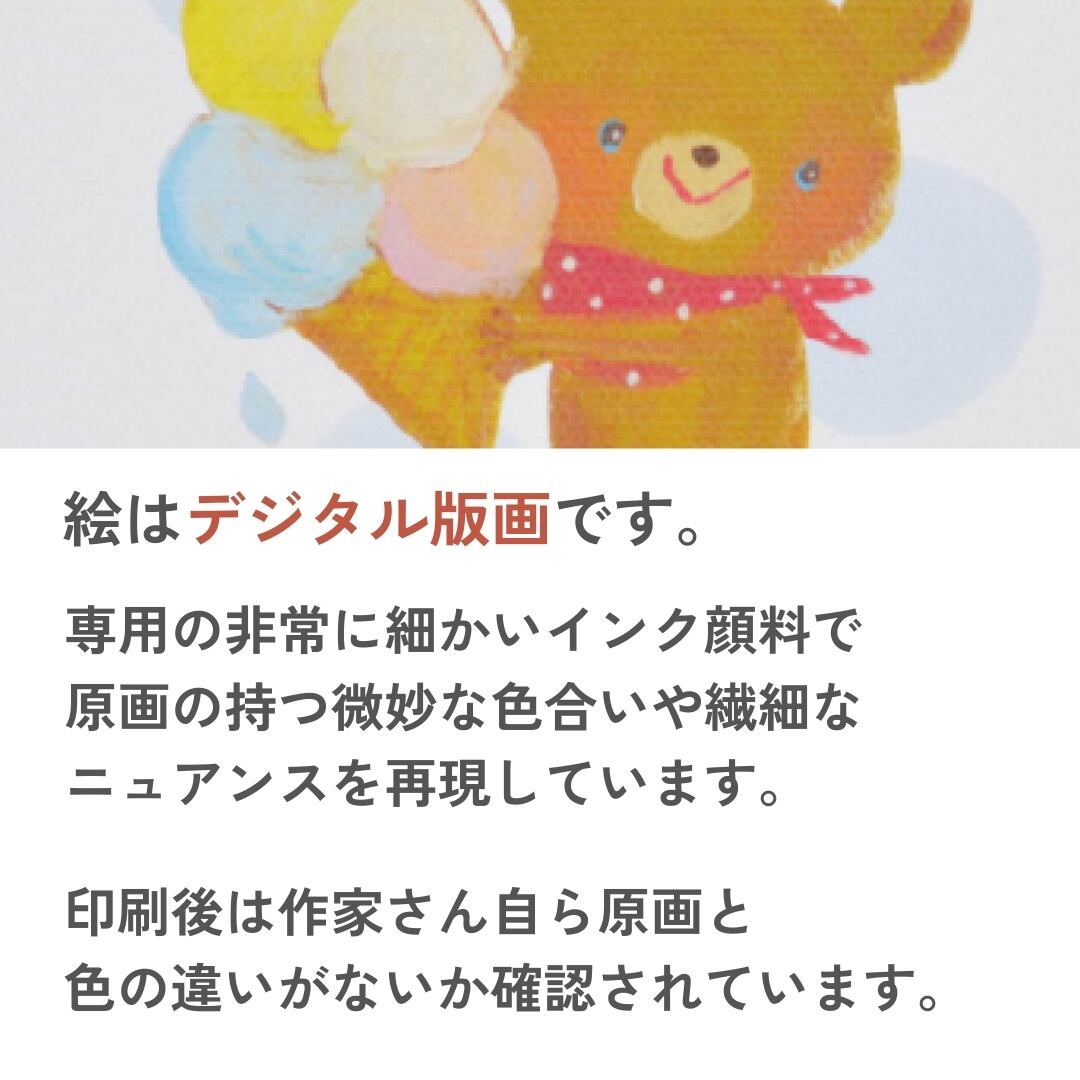 ふんわりとしたタッチで描かれた、アイスクリームを抱えるくまの姿が愛らしいインテリアアートです。赤いスカーフをなびかせながら、幸せそうに歩くくまの表情からは、見ている人まで笑顔になるような温かみが伝わってきます。背景には淡い水色のドットが広がり、軽やかでポップな印象を与えています。シンプルながらも構図のバランスが美しく、どこか懐かしい童話のような優しい世界観が魅力です。ナチュラルなキャンバス地の質感が、やさしさと手づくり感を一層引き立てています。かわいい動物のインテリアアートとしても人気の高い作品です。