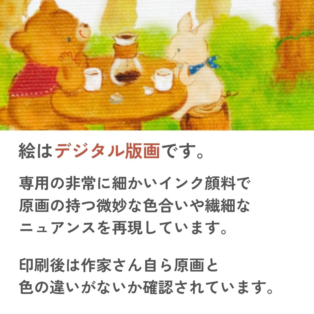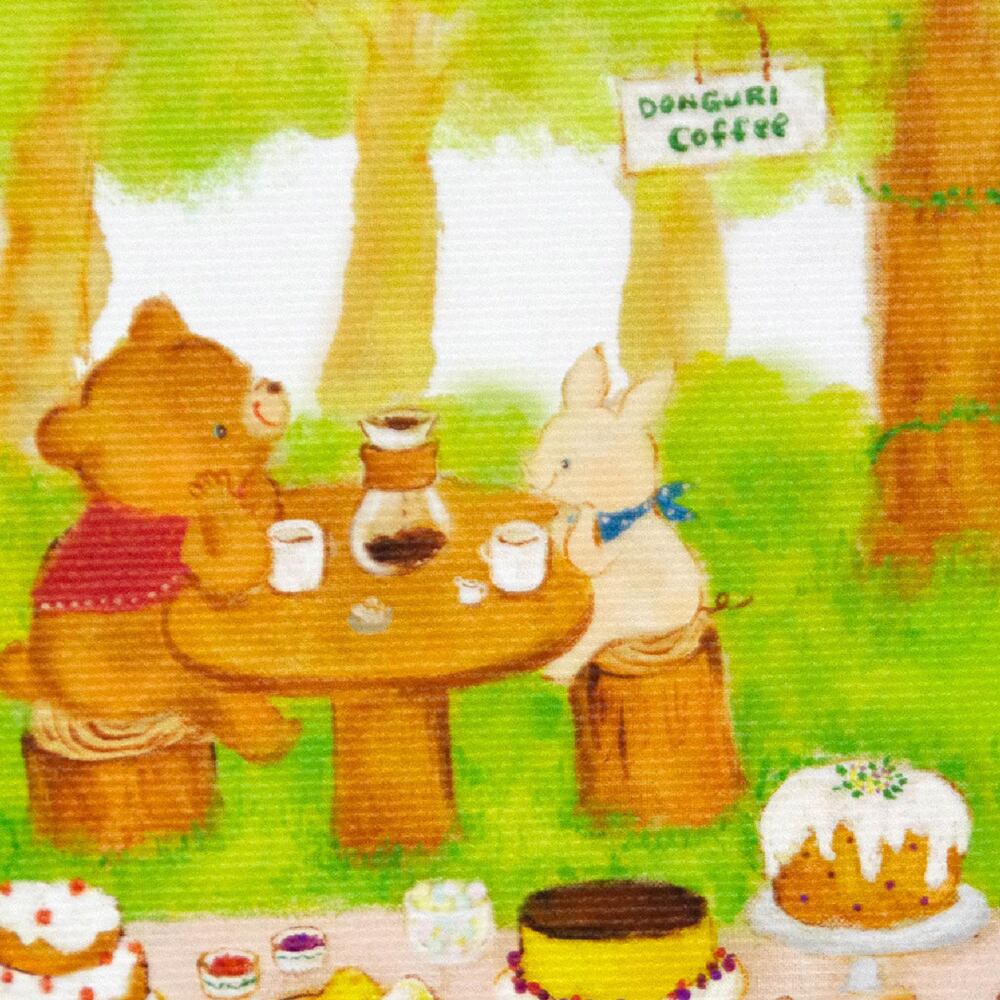 木漏れ日の差す森の中、丸太のテーブルでくまとうさぎがコーヒーを楽しむ穏やかな情景が描かれたインテリアアートです。テーブルの上には香ばしいパンや彩り豊かなケーキが並び、まるで小さなカフェのような心あたたまる雰囲気が広がっています。背景のやわらかな緑が作品全体を包み込み、穏やかな森の香りと静かな時間を感じさせます。キャンバスならではの質感が優しい筆づかいを引き立て、見ている人に自然の中で深呼吸するような安らぎを届けてくれます。